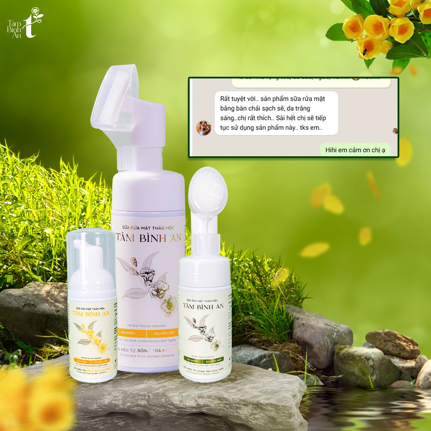 Mua tại TiktokMô tả: Sữa rửa mặt thảo mộc Tâm Bình An gồm các thành phần chủ yếu từ thiên nhiên, chiết xuất từ Trà Hoa Vàng mang tới các công dụng như làm sạch sâu, làm thông thoáng lỗ chân lông, duy trì độ ẩm tự nhiên cho da, chống oxy hóa vượt trội giúp ngăn ngừa mụn trên da, giúp da luôn tươi sáng và mềm mại. Dung tích: 150ml Ưu điểm: An toàn cho da: Đã được kiểm nghiệm da liễu Không chứa hóa chất độc hại, an toàn cho mọi loại da, kể cả da nhạy cảm. Làm sạch cho da hiệu quả: Loại bỏ bụi bẩn, bã nhờn và tế bào chết trên da giúp da thông thoáng và khỏe mạnh. Kích thích sản sinh collagen, giúp da săn chắc, trẻ trung và đàn hồi. Cấp ẩm và dưỡng da mềm mại: Nhờ chiết xuất từ Trà Hoa Vàng giàu vitamin, khoáng chất và các hợp chất chống oxy hóa, giúp nuôi dưỡng da từ sâu bên trong. Kiểm soát dầu nhờn: Loại bỏ bã nhờn dư thừa trên da, giúp da thông thoáng, ngăn ngừa mụn trứng cá. Thiết kế đầu rửa tạo bọt silicon giúp matxa da mặt, tạo bọt giúp thẩm thấu cho da tốt hơn, tiện lợi, dễ dàng tháo rời vệ sinh. Thành phần: Purified Water, Camellia Chrysantha (Trà Hoa Vàng), Perilla Frutescens Leaf Extract (Chiết xuất Lá Tía Tô), Lactuca indica Root Extract (Chiết xuất Rễ Bồ Công Anh), Saccharomyces/Rice Bran Ferment (Nguyên liệu lên men từ mầm cám Gạo), Ananas Sativus (Pineapple) Fruit Extract (Chiết xuất quả Dứa), Aqua (and) Disodium Cocoyl Glutamate (and) Sodium Cocoyl Glutamate, Hydrolyzed Yeast Protein, Glycerin, Tocopheryl Acetate (Vitamin E), PEG-40 Hydrogenated Castor Oil, Phenoxyethanol (and) Ethylhexylglycerin, Allantoin, Fragrance (Santal 33). KHÔNG CHỨA: SILICON, PARABEN, MÀU TỔNG HỢP, CHẤT CẤM, HÓA CHẤT, MÀI MÒN DA, GÂY TÁC DỤNG PHỤ. Công nghệ lên men tự nhiên giữ dưỡng chất mang lại hiệu quả rõ rệt sau 1-2 tuần sử dụng Công dụng:
