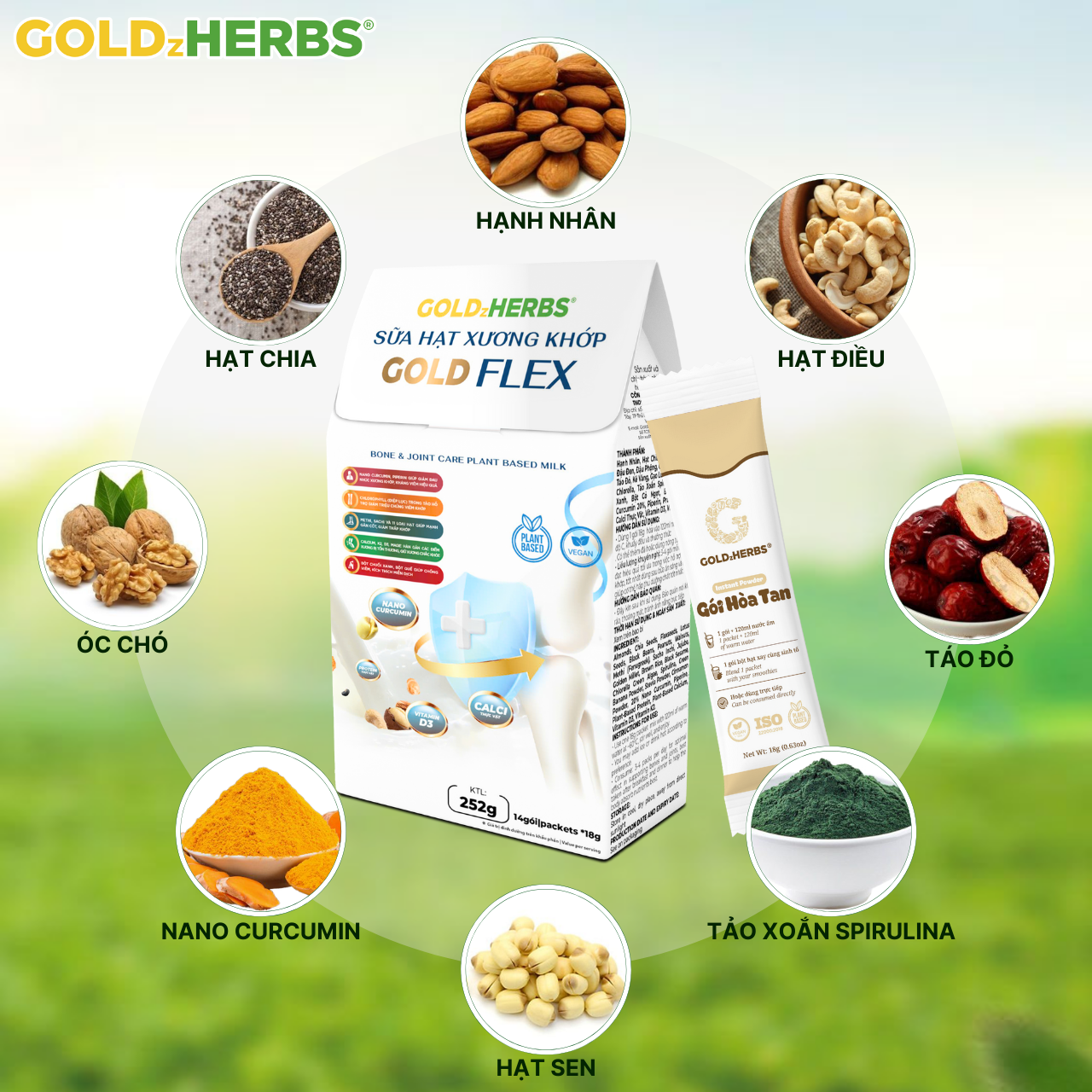 Sữa thực vật xương khớp Gold Flex CÔNG DỤNG - Tăng cường sức khỏe xương khớp. - Cung cấp canxi, giảm loãng xương. - Hỗ trợ kháng viêm, giảm đau. - Cải thiện linh hoạt