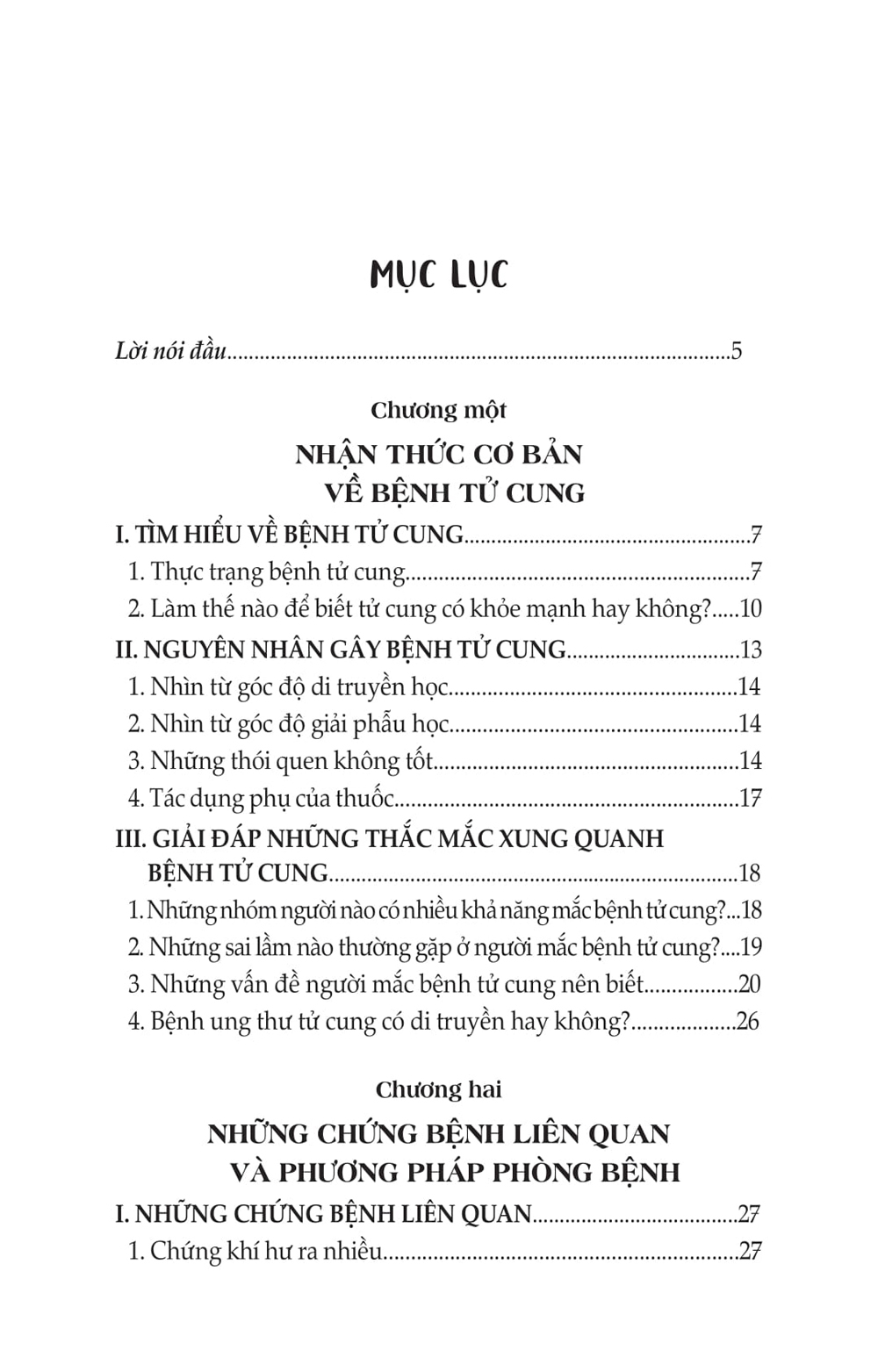 Tử cung là một bộ phận quan trọng thuộc cơ quan sinh dục của người phụ nữ. Nó có ý nghĩa quan trọng với hạnh phúc của nữ giới trong thiên chức làm mẹ và cao hơn nữa là để duy trì nòi giống. Do nằm sâu bên trong cơ thể nên bệnh tử cung rất khó quan sát và nhận biết bằng mắt thường. Người phụ nữ chỉ có thể dựa vào những biểu hiện khác thường của cơ thể thông qua chu kỳ kinh nguyệt, các cơn đau với mức độ khác nhau ở vùng bụng dưới, âm hộ để phát hiện những dấu hiệu đầu tiên của bệnh. Phương pháp đúng đắn và khoa học là thường xuyên thăm khám phụ khoa định kỳ nhằm ngăn chặn và phát hiện sớm bệnh tình, áp dụng những chỉ dẫn điều trị và sinh hoạt đúng đắn, phù hợp để điều trị triệt để. Để giúp một nửa nhân loại, những người phụ nữ có những nhận thức đúng đắn, khoa học về bệnh tử cung cũng như nắm được cơ hội phòng và chữa bệnh, hạn chế nguy cơ biến chứng, tái phát và tử vong do bệnh gây ra chúng tôi trân trọng gửi tới bạn đọc ấn phẩm này. Cuốn sách là hệ thống những tri thức khoa học được truyền đạt một cách sinh động, dễ hiểu những nguyên tắc điều dưỡng cũng như nguyên tắc dùng thuốc, hộ lý điều trị sinh hoạt phòng trị bệnh mỗi ngày để bạn có thể tránh xa bệnh tử cung và rất nhiều bệnh khác liên quan. Hy vọng cuốn sách sẽ được nhiều phụ nữ, đặc biệt là các bạn gái trẻ tuổi đón nhận như một món quà tinh thần hữu ích.