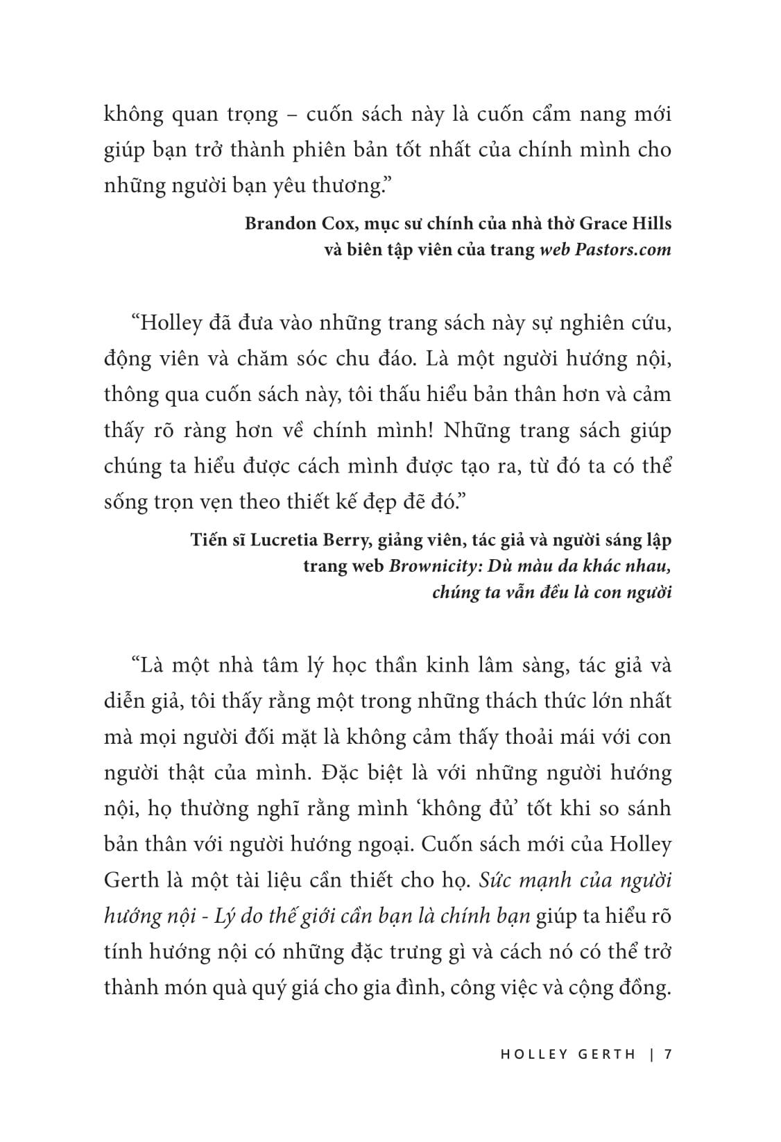 Trong cuốn sách Sức mạnh của người hướng nội – Lý do thế giới cần BẠN là CHÍNH BẠN, Holley Gerth đi sâu vào khoa học não bộ đằng sau tính hướng nội để giúp bạn hiểu các khía cạnh tâm lý, quan hệ và tinh thần của việc là một người hướng nội, từ đó cung cấp cái nhìn tổng quan toàn diện về tính hướng nội và khám phá cách người hướng nội có thể khai thác toàn bộ tiềm năng của m.ình.