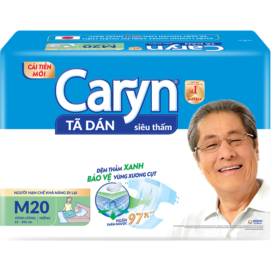 Tã dán Người Cao Tuổi Caryn Size M20 Siêu thấm Đệm thấm xanh bảo vệ vùng xương cụt (20 Miếng) Tã dán Siêu thấm Caryn cải tiến mới với "Đệm thấm xanh" bảo vệ vùng xương cụt,