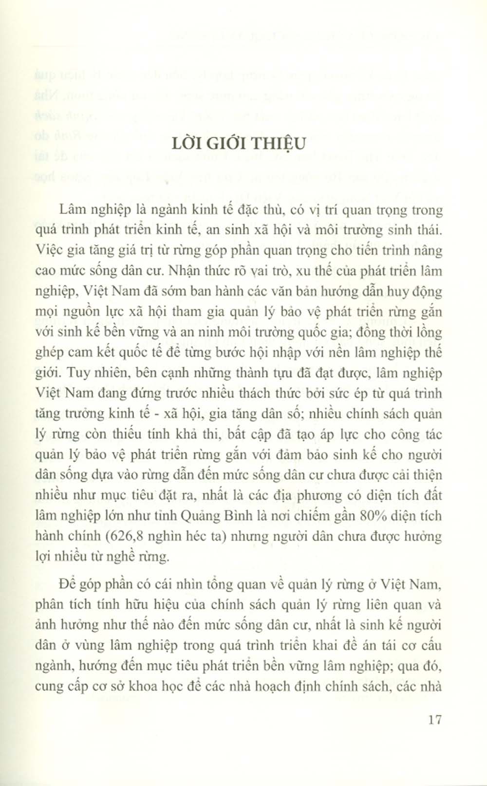 Lâm nghiệp là ngành kinh tế đặc thù, có vị trí quan trọng trong quá trình phát triển kinh tế, an sinh xã hội và môi trường sinh thái. Việc gia tăng giá trị từ rừng góp phần quan trọng cho tiến trình nâng cao mức sống dân cư. Nhận thức rõ vai trò, xu thế của phát triển lâm nghiệp, Việt Nam đã sớm ban hành các văn bản hướng dẫn huy động mọi nguồn lực xã hội tham gia quản lý bảo vệ phát triển rừng gắn với sinh kế bền vững và an ninh môi trường quốc gia; đồng thời lồng ghép cam kết quốc tế để từng bước hội nhập với nền lâm nghiệp thế giới. Tuy nhiên, bên cạnh những thành tựu đã đạt được, lâm nghiệp Việt Nam đang đứng trước nhiều thách thức bởi sức ép từ quá trình tăng trưởng kinh tế - xã hội, gia tăng dân số; nhiều chính sách quản lý rừng còn thiếu tính khả thi, bất cập đã tạo áp lực cho công tác quản lý bảo vệ phát triển rừng gắn với đảm bảo sinh kế cho người dân sống dựa vào rừng dẫn đến mức sống dân cư chưa được cải thiện nhiều như mục tiêu đặt ra, nhất là các địa phương có diện tích đất lâm nghiệp lớn như tỉnh Quảng Bình là nơi chiếm gần 80% diện tích hành chính (626,8 nghìn héc ta) nhưng người dân chưa được hưởng lợi nhiều từ nghề rừng.