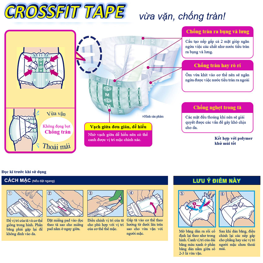 BAO BÌ SẢN PHẨM CÓ THỂ THAY ĐỔI THEO TỪNG ĐỢT NHẬP HÀNG Màng đáy thoáng khí dạng vải 100% Air-active Rãnh thấm siêu tốc giữ bề mặt tã khô thoáng Vách chống trào kép