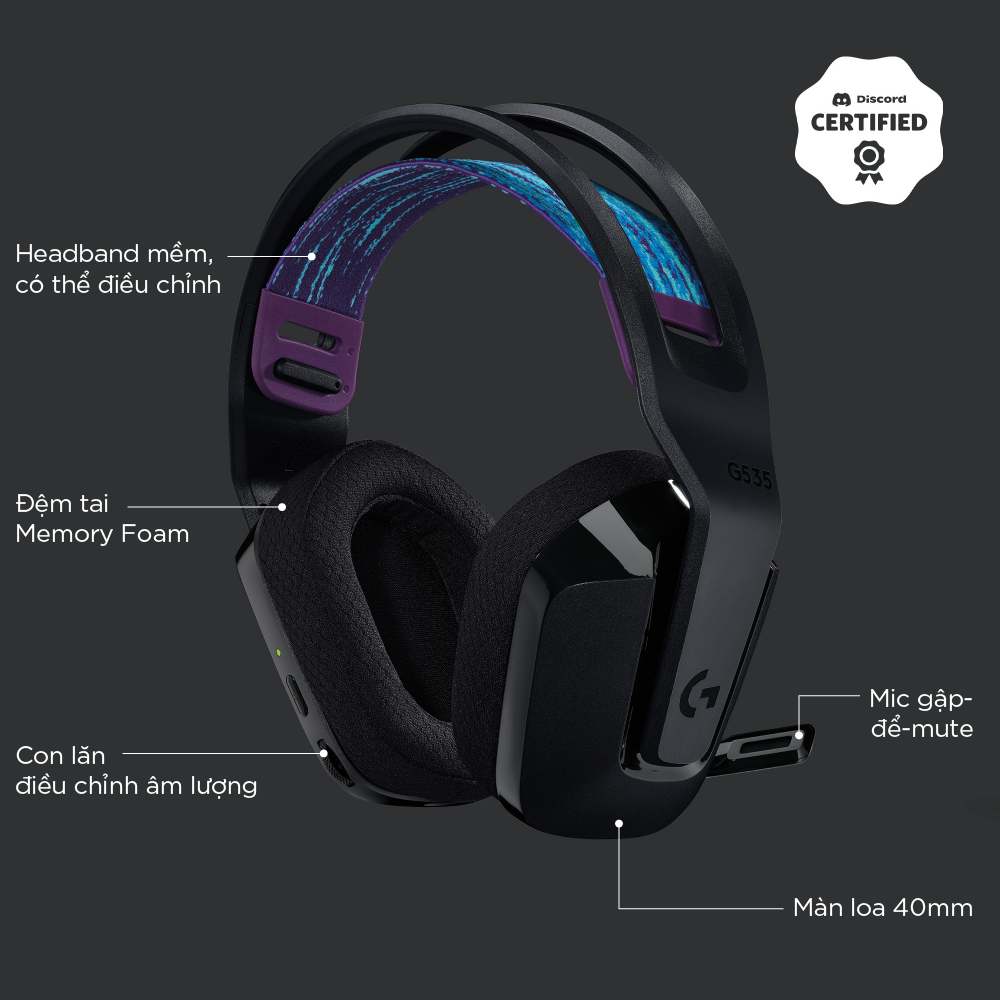 • Hoạt động với PC và PlayStation   LIGHTSPEED không dây: Công nghệ không dây LIGHTSPEED cấp độ chuyên nghiệp đem lại thời lượng pin 33 giờ (1) và sự tự do không dây đáng tin cậy lên tới 12 m Trọng lượng nhẹ và thoải mái Nặng chỉ 236 gram, G535 nhỏ và nhẹ hơn G733; quai đeo co dãn hai mặt giúp phân phối trọng lượng và có thể điều chỉnh cho độ vừa vặn tùy chỉnh Cắm vào là sử dụng được: Tối ưu hóa thời gian chơi của bạn với tai nghe chơi game dễ dùng, cắm vào là sử dụng; G535 sử dụng kết nối USB tương thích với PC và các thiết bị chơi game PlayStation Tương thích PC và máy chơi game: PlayStation 5, PlayStation 4 Điều khiển trên khung tai nghe Nút xoay âm lượng nằm trực tiếp trên khung tai nghe, để nhanh chóng tăng âm lượng trò chơi, âm nhạc hay cuộc trò chuyện của bạn; chỉ cần gấp micrô lên để tắt tiếng và cất gọn Màng loa 40 mm Với màng loa neodymium 40 mm, chiếc tai nghe chơi game không dây này đem lại âm thanh nổi rõ ràng, trong trẻo và sâu lắng, giúp cho trò chơi của bạn trở nên chân thực hơn. Thoải mái suốt ngày Chụp tai bằng cao su non thoải mái và vật liệu vải lưới thể thao lý tưởng khi sử dụng lâu dài G535 đã được chứng nhận Discord để đảm bảo đem lại hiệu suất giao tiếp rõ như pha lê với âm thanh và độ rõ ràng giọng nói tuyệt vời YÊU CẦU HỆ THỐNG: Cổng USB cho LIGHTSPEED: Windows 10, macOS X 10.14 trở lên Kết nối Internet cho Phần mềm G HUB của Logitech (2) TRONG HỘP GỒM Tai nghe chơi game G535 Quai đeo mềm hai mặt (đi kèm) Đầu thu USB LIGHTSPEED Dây cáp sạc USB-C Tài liệu hướng dẫn sử dụng Bảo hành 2 năm phần cứng (1) Có thể thay đổi tùy theo người dùng và điều kiện sử dụng máy tính. Thời gian sử dụng pin dựa trên mức âm lượng tai nghe được đặt thành 50% (2) Các tính năng nâng cao yêu cầu phần mềm G HUB của Logitech. Tải về miễn phí tại LogitechG