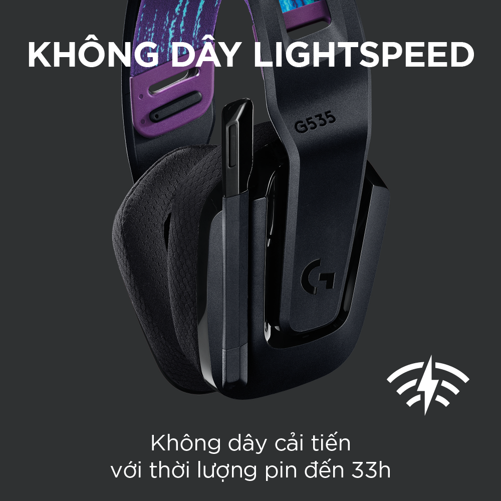 Tai nghe game không dây Lightspeed Logitech G535  - Trọng lượng nhẹ, âm thanh nổi, tương thích PC, PS4, PS5, Mic gấp để tắt tiếng Tai nghe chơi game không dây G535 đem đến cho bạn hiệu suất, sự tự do và thoải mái trong tất cả những buổi chơi game. Công nghệ LIGHTSPEED không dây tiên tiến có độ trễ thấp đem lại sự tự do không dây đáng tin cậy lên tới 12 m và thời lượng pin đáng kinh ngạc 33 giờ.(1) Màng loa 40 mm đem lại âm thanh nổi rõ ràng, trong trẻo và sâu lắng. Chỉ nặng 236 gram, quai đeo có thể điều chỉnh và chụp tai bằng cao su non mềm mại đảm bảo sự thoải mái suốt ngày. Các nút điều khiển trên tai nghe cho phép bạn nhanh chóng tăng âm lượng trò chơi hoặc âm nhạc. Chỉ cần gấp lên để tắt tiếng và giấu gọn gàng. G535 đã được chứng nhận Discord để đảm bảo đem lại hiệu suất giao tiếp rõ như pha lê với âm thanh và độ rõ ràng giọng nói tuyệt vời. - LIGHTSPEED không dây cho kết nối nâng cao, đáng tin cậy. - Thời lượng pin để chơi game là 33 giờ - Chỉ 236 gram - Thiết kế co dãn với đệm tai làm từ cao su non đem lại sự thoải mái suốt cả ngày - Điều khiển âm lượng trên tai và mic gấp-để-tắt tiếng - Màng loa 40 mm cho âm thanh nổi rõ ràng, trong trẻo - Được chứng nhận Discord cho cuộc giao tiếp rõ ràng - Hoạt động với PC và PlayStation LIGHTSPEED không dây: Công nghệ không dây LIGHTSPEED cấp độ chuyên nghiệp đem lại thời lượng pin 33 giờ (1) và sự tự do không dây đáng tin cậy lên tới 12 m Trọng lượng nhẹ và thoải mái Nặng chỉ 236 gram, G535 nhỏ và nhẹ hơn G733; quai đeo co dãn hai mặt giúp phân phối trọng lượng và có thể điều chỉnh cho độ vừa vặn tùy chỉnh Cắm vào là sử dụng được: Tối ưu hóa thời gian chơi của bạn với tai nghe chơi game dễ dùng, cắm vào là sử dụng; G535 sử dụng kết nối USB tương thích với PC và các thiết bị chơi game PlayStation Tương thích PC và máy chơi game: PlayStation 5, PlayStation 4   Điều khiển trên khung tai nghe Nút xoay âm lượng nằm trực tiếp trên khung tai nghe, để nhanh chóng tăng âm lượng trò chơi, âm nhạc hay cuộc trò chuyện của bạn; chỉ cần gấp micrô lên để tắt tiếng và cất gọn Màng loa 40 mm Với màng loa neodymium 40 mm, chiếc tai nghe chơi game không dây này đem lại âm thanh nổi rõ ràng, trong trẻo và sâu lắng, giúp cho trò chơi của bạn trở nên chân thực hơn. Thoải mái suốt ngày Chụp tai bằng cao su non thoải mái và vật liệu vải lưới thể thao lý tưởng khi sử dụng lâu dài G535 đã được chứng nhận Discord để đảm bảo đem lại hiệu suất giao tiếp rõ như pha lê với âm thanh và độ rõ ràng giọng nói tuyệt vời   YÊU CẦU HỆ THỐNG: Cổng USB cho LIGHTSPEED: Windows 10, macOS X 10.14 trở lên Kết nối Internet cho Phần mềm G HUB của Logitech (2) TRONG HỘP GỒM - Tai nghe chơi game G535 - Quai đeo mềm hai mặt (đi kèm) -