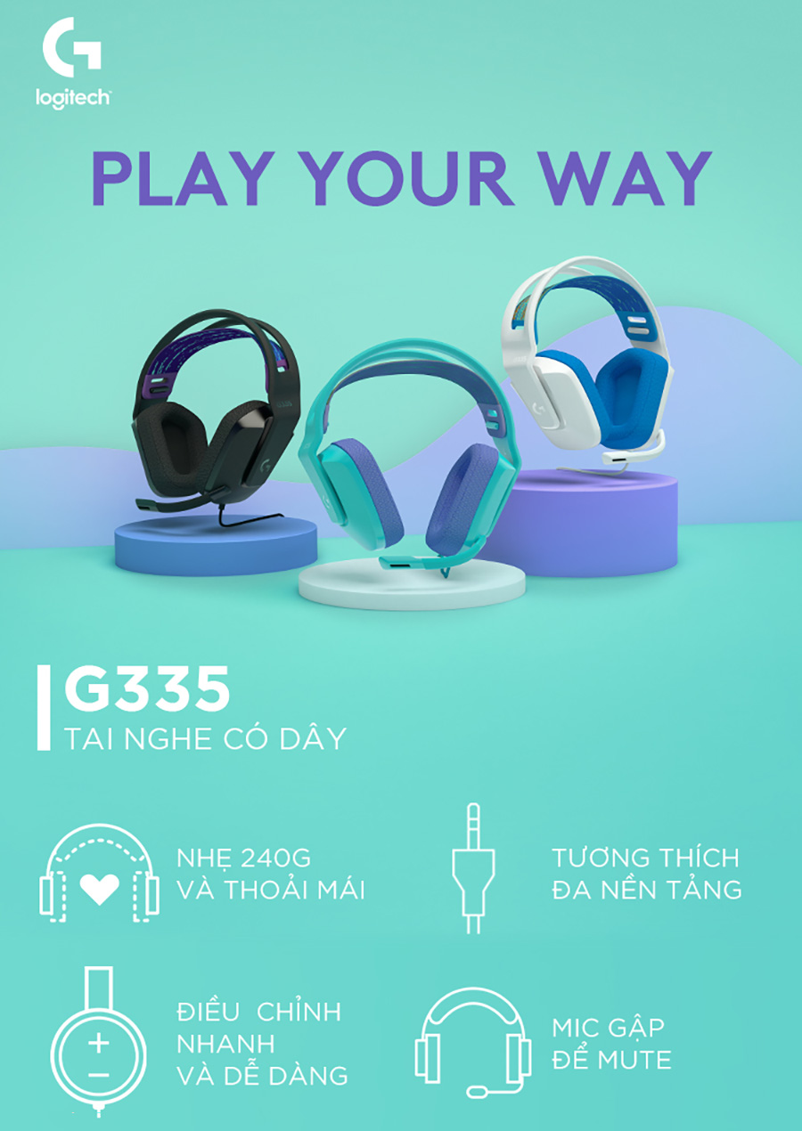 Chơi đầy phong cách G335 có nhiều màu sắc, mỗi màu lại có dây quai đeo hai mặt sống động và chụp tai phù hợp. Dây mềm mại, co dãn có hai mặt để bạn có thể chọn lựa màu sắc và giặt được - để chúng trông luôn mới. Khi bạn đã sẵn sàng cho diện mạo và tâm trạng mới, chỉ cần lấy một chiếc dây mới hoặc chọn từ nhiều loại vỏ bọc mic sành điệu, rực rỡ.