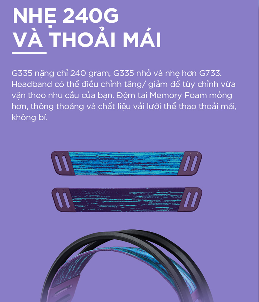 Bước vào vùng thoải mái Tai Nghe Gaming Có Dây Logitech G335 thiết kế quai đeo co dãn giúp phân phối trọng lượng và giảm áp lực. Chụp tai bằng cao su mềm mại, thông thoáng và vật liệu vải lưới thể thao bao quanh tai đem đến lực vừa phải để giữ nguyên vị trí. Chỉ nặng 240 gram, G335 là phiên bản nhỏ và nhẹ hơn của chiếc tai nghe không dây LIGHTSPEED G733 đã giành giải thưởng.