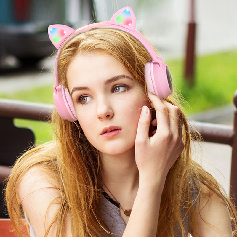 Tai nghe nhét tai mèo không dây Bluetooth 5.0 cho trẻ em với đèn LED 3 màu gradient, hỗ trợ đài FM/Thẻ TF/AUX in.