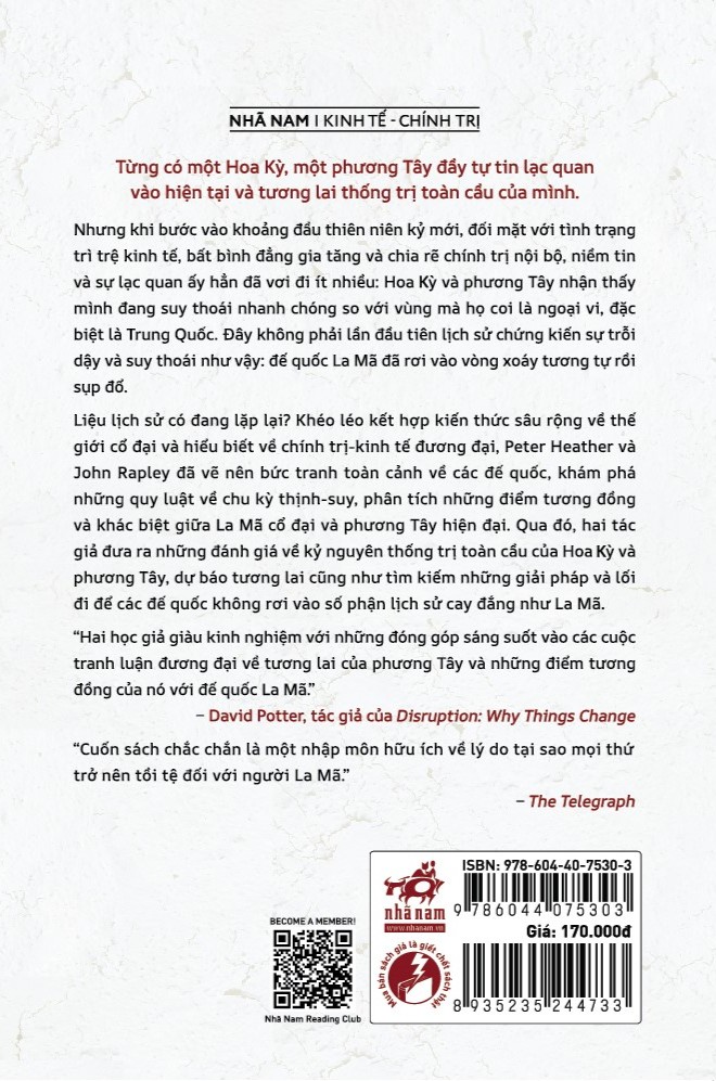 Liệu lịch sử có đang lặp lại? Khéo léo kết hợp kiến thức sâu rộng về thế giới cổ đại và hiểu biết về chính trị-kinh tế đương đại, Peter Heather và John Rapley đã vẽ nên bức tranh toàn cảnh về các đế quốc, khám phá những quy luật về chu kỳ thịnh suy, phân tích những điểm tương đồng và khác biệt giữa La Mã cổ đại và phưng Tây hiện đại. Qua đó, hai tác giả đưa ra những đánh giá về kỷ nguyên thống trị toàn cầu của Hoa Kỳ và phương Tây, dự báo tương lai cũng như tìm kiếm những giải pháp và lối đi để các đế quốc không rơi và số phận lịch sử cay đắng như La Mã.