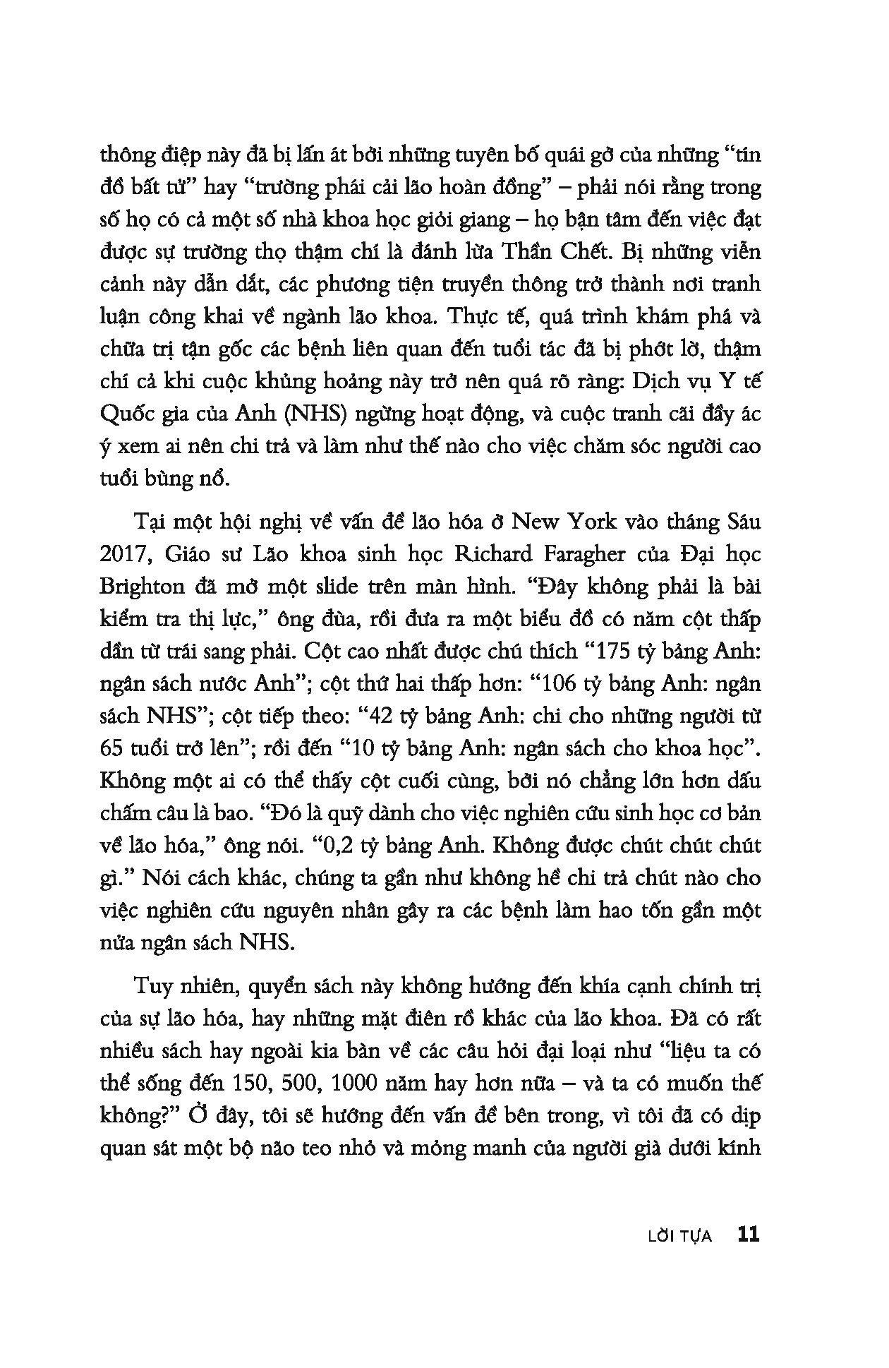 Lão hóa là vấn đề mà tất cả chúng ta đều quan tâm, tuy nhiên chưa có sự đồng thuận và thống nhất giữa các nhà khoa học về nguyên nhân và cơ chế của quá trình này. Có người thì cho rằng đó là quá trình hao mòn cơ bản, người thì tin rằng đây là quy luật được lập trình sẵn để kiểm soát về mặt di truyền, thậm chí có người tin rằng lão hóa là bệnh, có thể được đều ị nhằm kéo dài tuổi thọ đến vô tận… Trong cuốn sách này, Sue Armstrong sẽ kể câu chuyện về quá trình tìm hiểu sự lão hóa; trình bày các nghiên cứu, phát kiến mới nhất của khoa học về quá trình này.