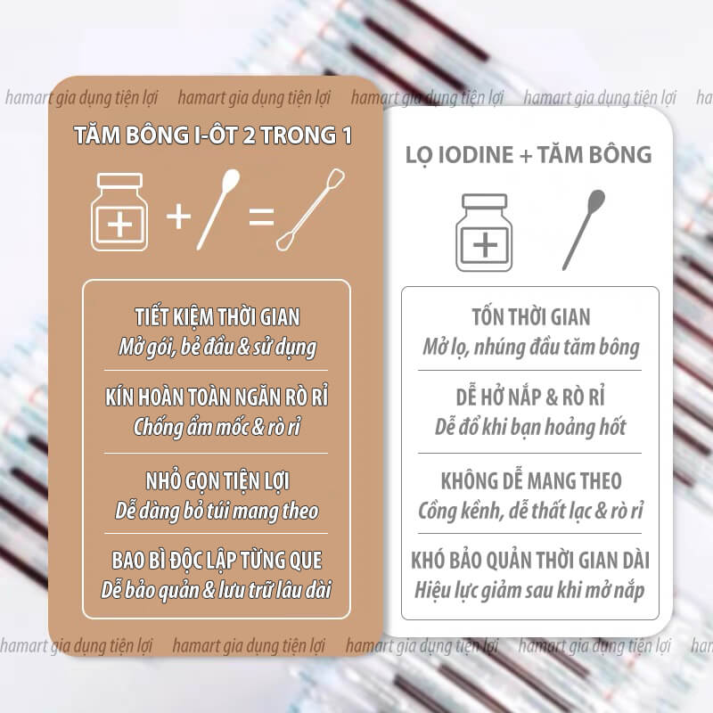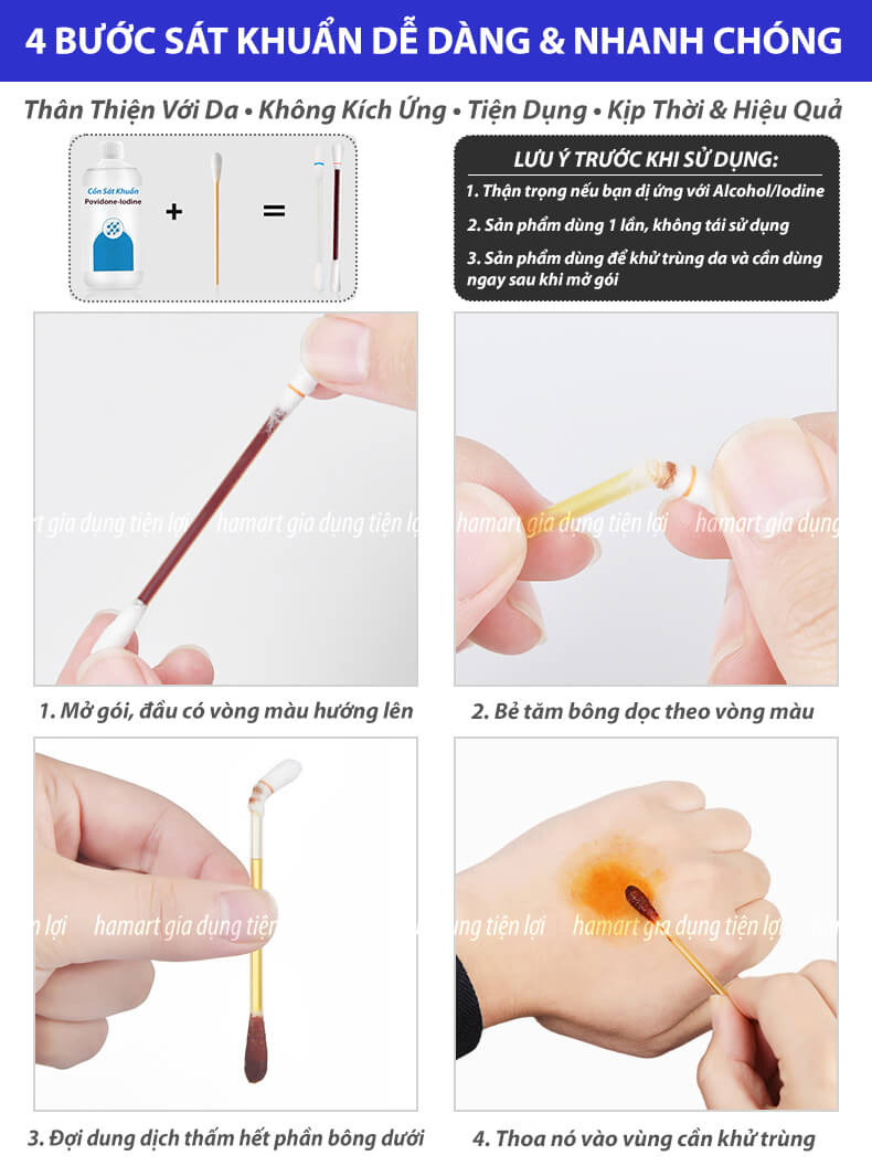 Tăm bông y tế tẩm cồn và i-ốt đỏ khử trùng 2 trong 1 là sản phẩm tiện dụng, kết hợp giữa dung dịch sát khuẩn (Povidone-Iodine hoặc cồn) và đầu bông mềm mại. Thiết
