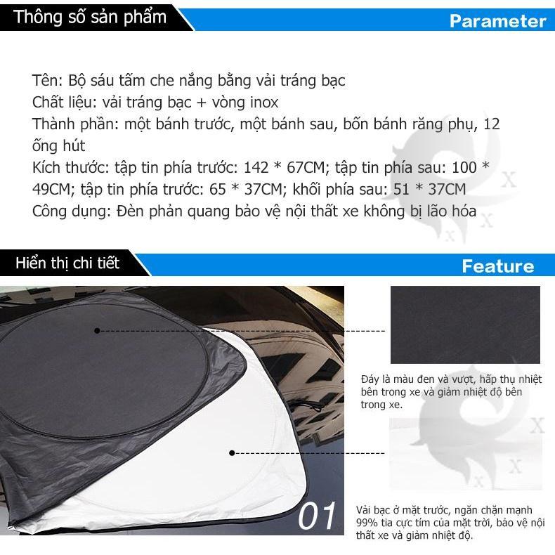 - Ánh nắng chiếu qua các cửa kính ô tô luôn làm bạn cảm giác khó chịu và làm lóa mắt bạn khi ngồi trong xe. Bộ che nắng xe giúp bảo vệ bạn khỏi ánh nắng trực tiếp, và hạn chế tia cực tím UV chiếu vào xe. Bộ che nắng được bằng chất liệu đặc biệt, có khả năng tạo ra ánh sáng dịu mắt mà không hề bị tối như các loại tấm che thông thường khác. - - Với kiểu dáng và thiết kế đẹp mắt nhất định bộ che nắng là lựa chọn lý tưởng nhất của bạn, góp phần làm cho ngôi nhà di động của bạn trở nên sang trọng và tiện nghi hơn. Thông tin sản phẩm: