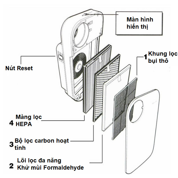 - Tấm lọc giúp giảm lượng hơi TVOC xuống còn 0.01mg/m3 trong không khí nhờ vào than dừa hoạt tính trong tấm lọc Loại bỏ hiệu quả các khí độc hại