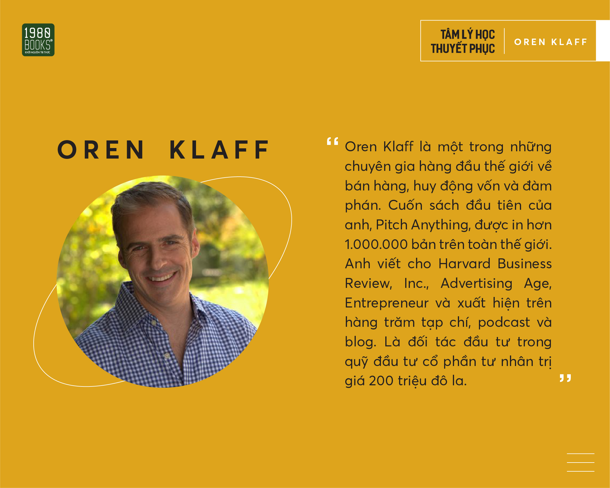 Oren Klaff là một trong những chuyên gia hàng đầu thế giới về bán hàng, huy động vốn và đàm phán. Cuốn sách đầu tiên của anh, Pitch Anything, được in hơn 1.000.000 bản trên toàn thế giới. Anh viết cho Harvard Business Review, Inc., Advertising Age, Entrepreneur và xuất hiện trên hàng trăm tạp chí, podcast và blog. Là đối tác đầu tư trong quỹ đầu tư cổ phần tư nhân trị giá 200 triệu đô la.