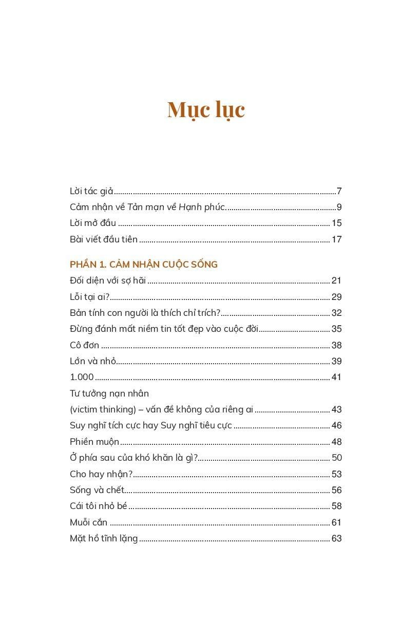 Tôi đã đọc nhiều sách viết về hạnh phúc, về giá trị sống và tư duy tích cực, về tâm linh… của các bậc thầy. Tôi nghĩ là mình cũng đã hiểu và tích lũy được tư duy cho hành trình tìm đến sự an lạc và có thể chia sẻ với mọi người. Nhưng những tản văn ngắn về hạnh phúc này cho tôi thấy có những góc nhìn, những cảm nhận về hạnh phúc thật gần gũi và giản đơn mà tôi cứ nghĩ đâu xa.
