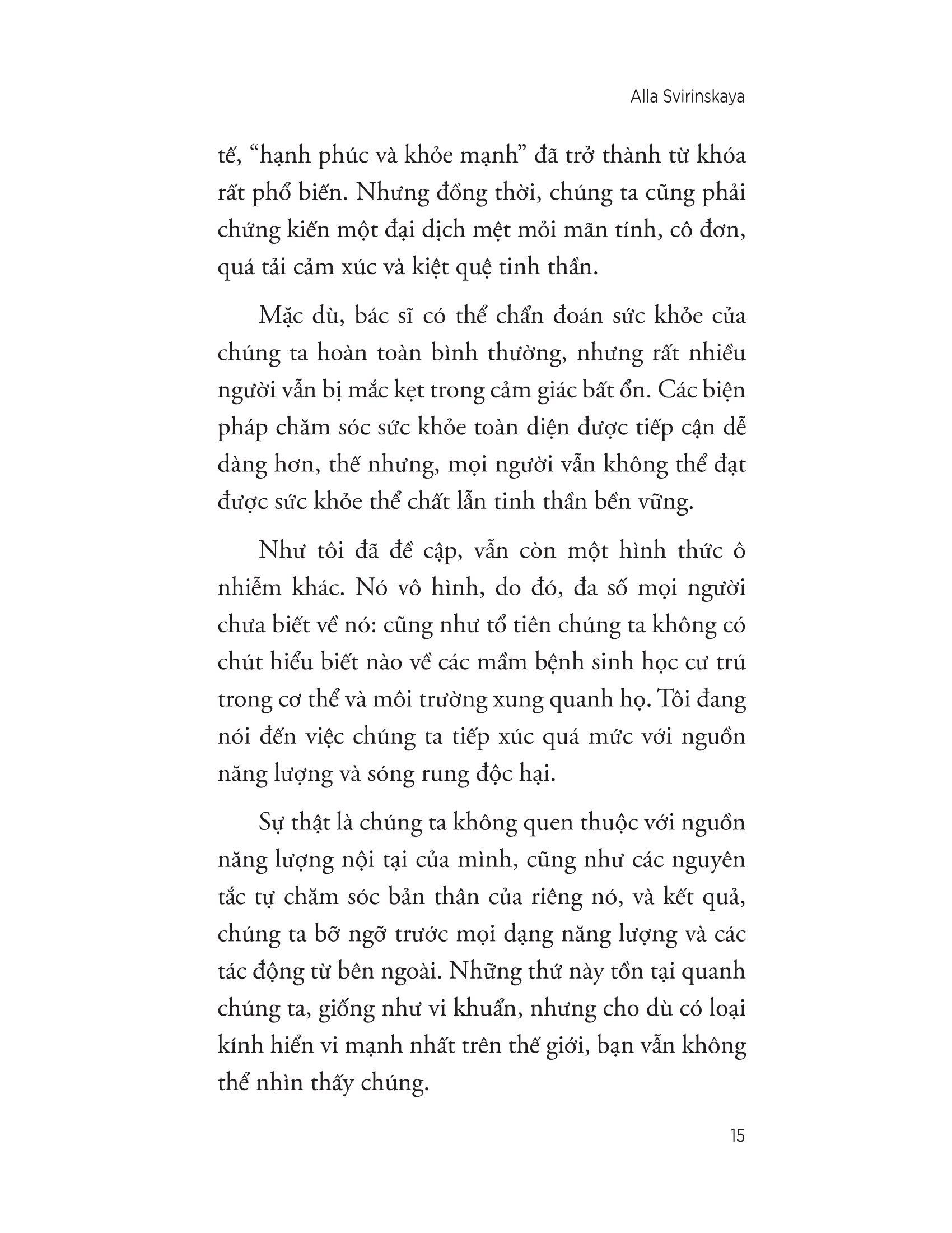 Vầng hào quang chứa năng lượng xung quanh ta là một phần quý giá trong danh tính của chúng ta, nó độc nhất như dấu vân tay của chúng ta vậy. Nói cách khác, vầng hào quang có thể được gọi là “ID năng lượng” riêng biệt, phân biệt trạng thái của mỗi người. Tần số rung động cảm xúc cá nhân sẽ cung cấp cho bạn những kiến thức về năng lượng, từ đó hướng dẫn chi tiết cách mở khóa “ID năng lượng” của riêng bạn và cách sử dụng nó để định hướng cuộc sống của bản thân. Alla làm sáng tỏ những thuật ngữ thường bị hiểu lầm, như “thanh lọc”, “thanh tẩy năng lượng”, “ma cà rồng hút năng lượng” để bạn có thể biến nỗi sợ tiêu cực thành siêu năng lực đích thực của m.ình.