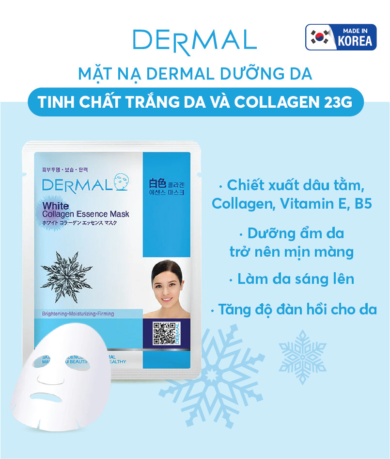 Mặt nạ dưỡng da tinh chất trắng da với chiết xuất từ thiên nhiên giúp làm trắng, săn chắc, cho bạn làn da hoàn hảo như mơ ước. Tác dụng: Mặt nạ trắng da giúp ngăn ngừa quá trình tổng hợp melanin và ngư­ng quá trình hình thành sắc tố da, thúc đẩy quá trình làm trắng da, làm mờ các vết thâm, nám trên da. Đồng thời vitamin E giúp làm mềm và mịn da cho làn da trắng sáng rạng rỡ. Mặt nạ bao gồm các vitamin A, B, E,ần thiết cho da, bổ sung vitamin và dưỡng chất giúp nuôi dưỡng và làm trắng từ sâu bên trong. Đồng thời ngăn ngừa quá trình lão hóa, làm mờ các vết thâm nám, tàn nhang. Cho bạn làn da trắng sáng săn chắc. Mặt nạ lành tính, không gây kích ứng, phù hợp với mọi làn da. Cách dùng: Rửa sạch mặt, trải rộng mặt nạ khắp mặt, sau 20-30 phút tháo bỏ mặt nạ, massage nhẹ để tăng hiệu quả (Mùa đông, trư­ớc khi sử dụng, có thể ngâm cả gói trong nư­ớc nóng từ 50-60 độ C trong vòng 2-3 phút). Sản phẩm thích hợp với mọi loại da. Thành phần: Mặt nạ d­ưỡng da đư­ợc chiết xuất 100% từ tự nhiên có kết hợp với tinh chất ngọc trai, vitamin E,A và sợi Collagen tổng hợp Hạn sử dụng: 03 năm kể từ ngày sản xuất (in trên bao bì) .