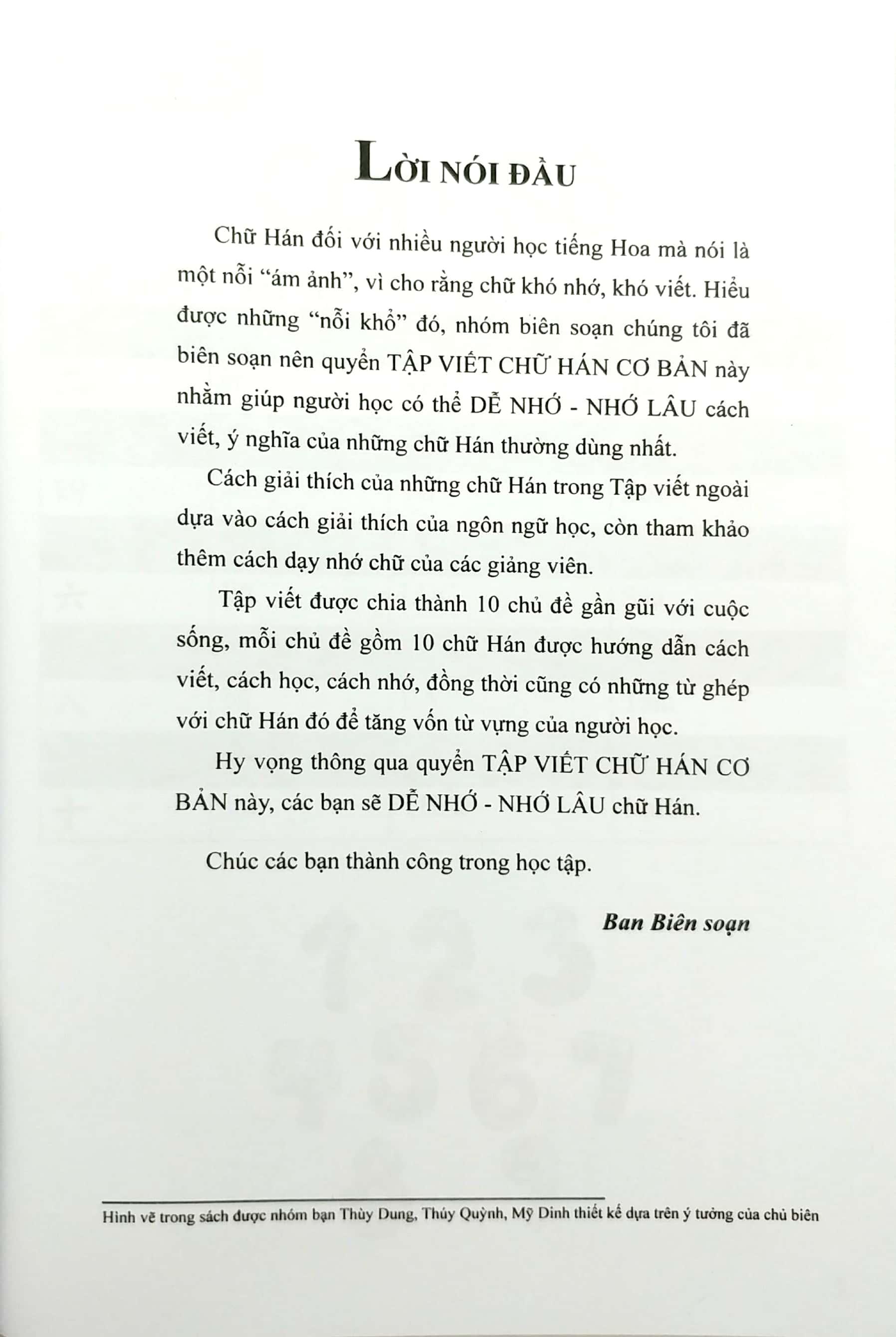 Tập Viết Chữ Hán Theo Giáo Trình Hán Ngữ Phiên Bản Mới Chúng ta đều biết, chữ Hán thuộc hệ chữ tượng hình, nó khác hoàn toàn với hệ chữ Latinh mà người Việt chúng ta đang sử dụng. Bởi vậy, hiện nay, đa số những người học tiếng Trung Quốc nói chung đều có tâm lý sợ học chữ Hán, đặc biệt là với những người mới bắt đầu. Cuốn Tập viết chữ Hán - Dựa theo giáo trình Hán ngữ phiên bản mới được biên soạn để giúp đỡ các bạn học tốt chữ Hán ngay từ trong những giai đoạn ban đầu. Cuốn sách này được biên soạn với nội dung bám sát giáo trình Hán ngữ sơ cấp phiên bản mới. Các chữ Hán được soạn ra từ hệ thống từ mới của từng bài, đi kèm phiên âm, nghĩa Hán Việt và nghĩa gốc của từng từ. Phần tập viết phiên âm và tập viết các chữ Hán theo thứ tự từng nét một sẽ giúp các bạn học và nhớ chữ Hán lâu hơn. Nội dung của sách được xây dựng theo 4 phần chính: Phần 1: Danh mục bộ thủ chữ Hán: cung cấp cho các bạn danh mục 214 bộ thủ chữ Hán, không chỉ bao gồm cách viết, tên bộ, phiên âm và ý nghĩa tiếng Việt. Phần 3: Bao gồm 40 bài tập viết chữ hán Mỗi bài sẽ giới thiệu cho bạn từ 2-6 bộ thủ mới (bao gồm âm hán Việt, cách viết chữ từng nét,). Tiếp đó là các cụm từ mới có bộ thủ đó bao gồm cả phiên âm và nghĩa tiếng việt chi tiết giúp các bạn luyện tập và ghi nhớ bộ thủ, đồng thời thu thập thêm nhiều từ vựng mới. Phần 4: 500 chữ Hán cơ bản: Tại phần này sẽ cung cấp cho bạn 500 chữ Hán cơ bản gồm cả chữ phồn thể và giản thể , xếp thứ tự theo phiên âm Pinyin. Mỗi chứ Hán được giải thích rõ về HÌNH-ÂM-NGHĨA và cách viết (tả pháp). Cuốn sách sẽ là người bạn đồng hành thân thiết, hỗ trợ đắc lực cho các bạn yêu thích và muốn học tốt tiếng Trung.