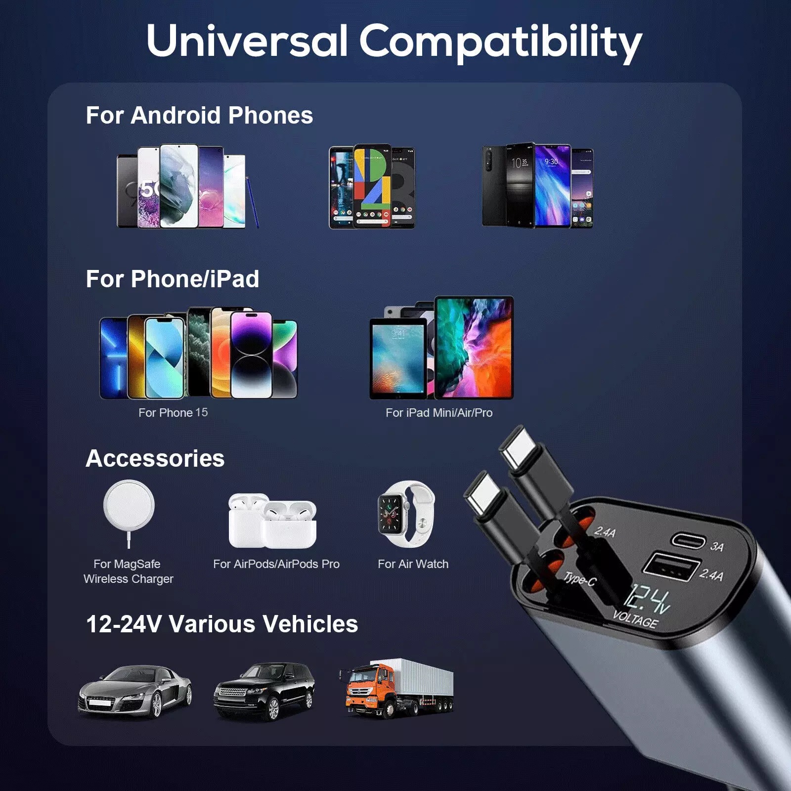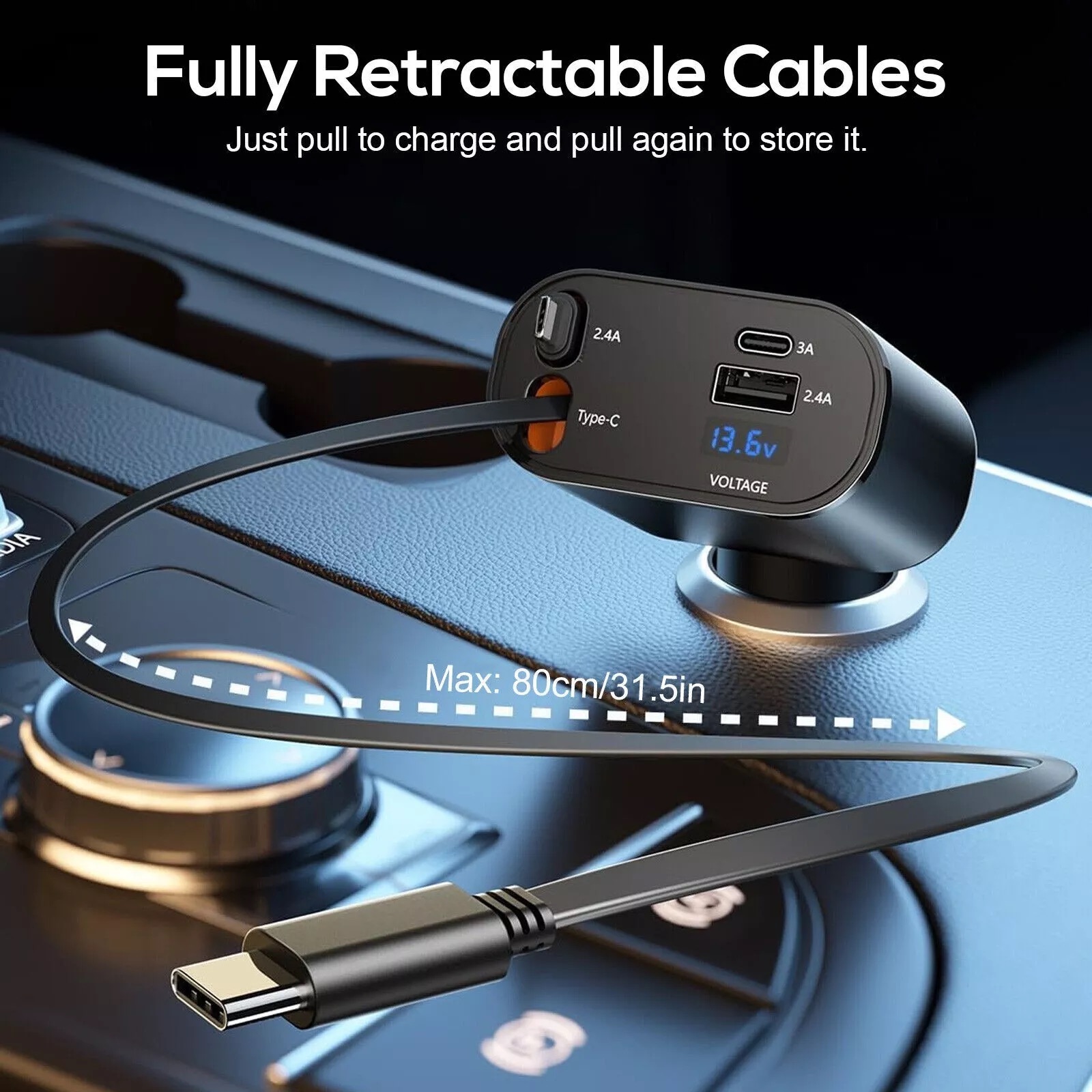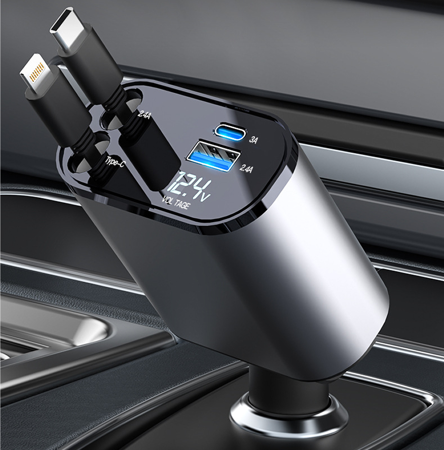 Quản lý cáp theo phong cách: Giữ cho ô tô của bạn sạch sẽ và gọn gàng với hệ thống cáp có thể thu vào. Cáp không vướng víu kéo dài trơn tru lên đến 80cm và tự động thu trở lại. Thiết kế linh hoạt của nó có thể mở rộng để dễ dàng đáp ứng mọi yêu cầu sạc của bạn.