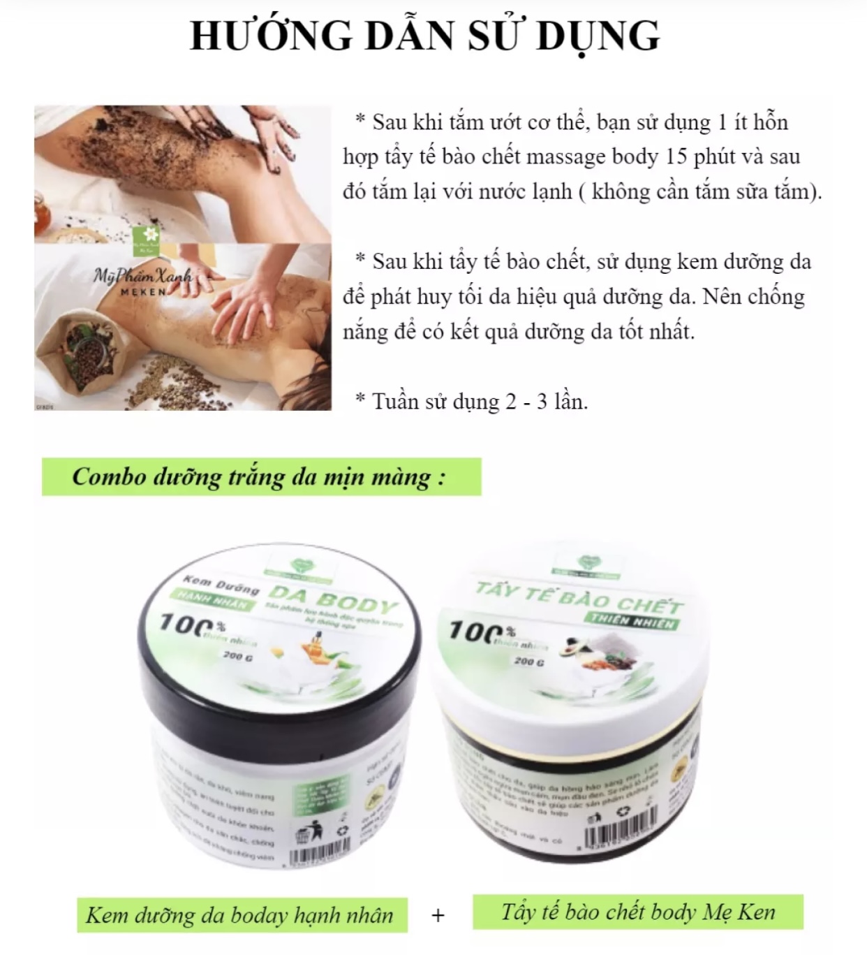 - Sau khi tẩy tế bào chết sẽ giúp các sản phẩm dưỡng da, mask thẩm thấu sâu và hiệu quả nhanh hơn. - Làm giảm viêm nang lông CÁCH SỬ DỤNG : Sử dụng tối đa 2 lần/ tuần Sau khi ướt cơ thể, lấy một ít hỗn hợp massage nhẹ nhàng lên body, chà những nơi chài sần kỹ 1 chút sau đó tắm sạch lại bằng nước lạnh. BẢO QUẢN: bên ngoài nhiệt độ thường *HẠN DÙNG: 18 tháng kể từ ngày sản xuất. LƯU Ý khách hàng: Vì sản phẩm thành phần có mật ong rừng, nên khi vận chuyển có thể bị trào mật. Tuy nhiên sp ko bị hư hại. Chỉ cần để nguyên hộp vặn nắp kín rồi rửa lại hộp cho sạch là được.