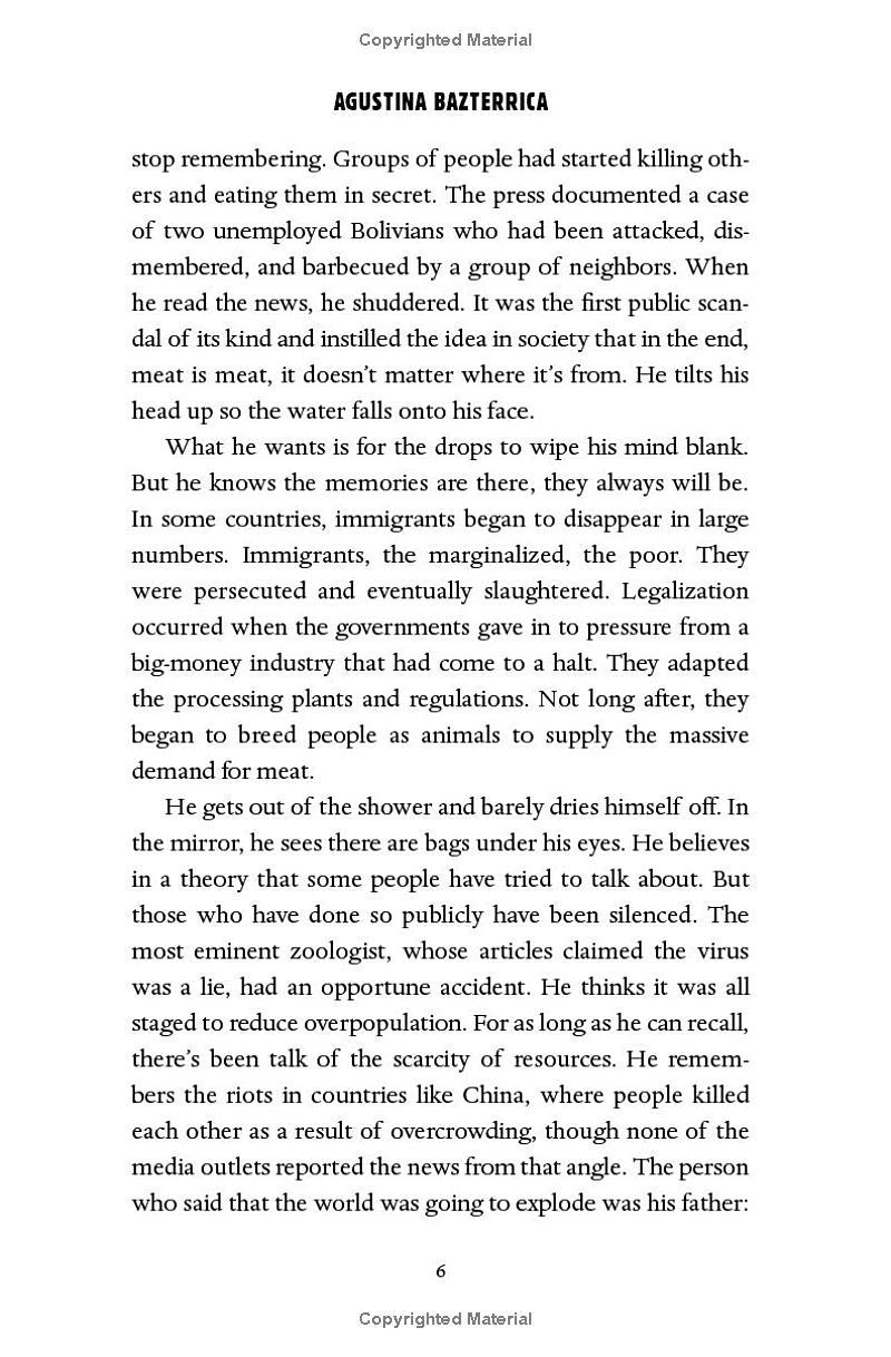 His wife has left him, his father is sinking into dementia, and Marcos tries not to think too hard about how he makes a living. After all, it happened so quickly. First, it was reported that an infectious virus has made all animal meat poisonous to humans. Then governments initiated the “Transition.” Now, eating human meat—“special meat”—is legal. Marcos tries to stick to numbers, consignments, processing.