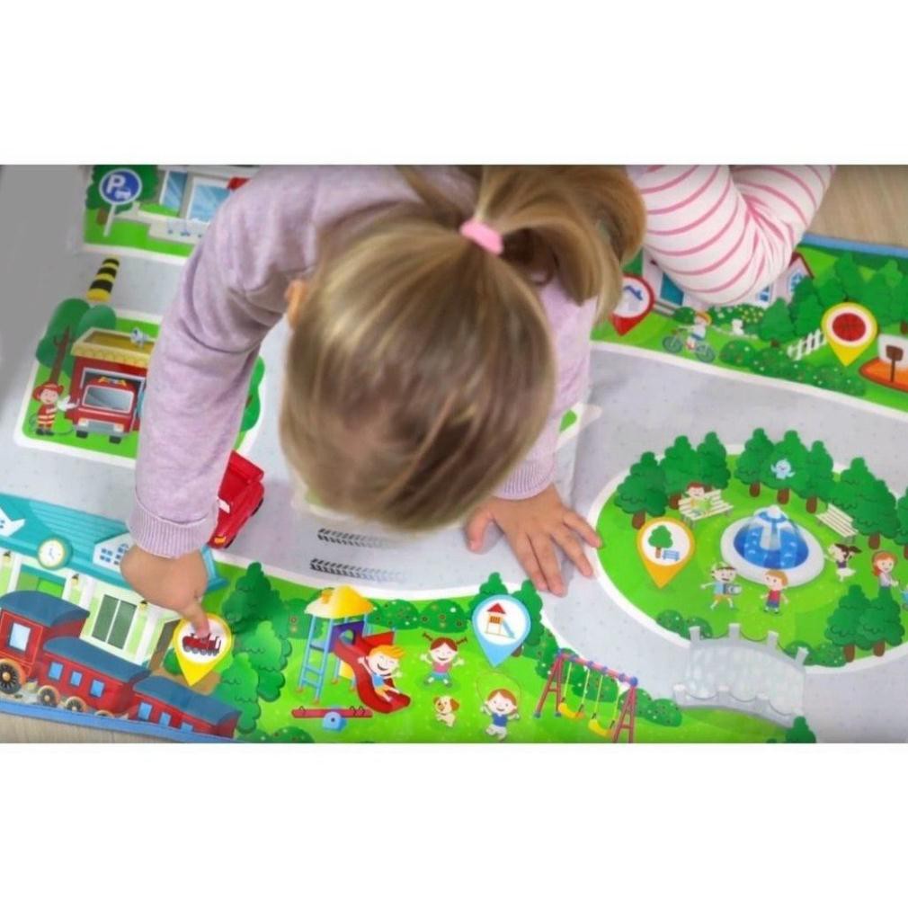 - Được làm giống như một bản đồ chi tiết mô tả một khu dân cư mới xây, khi chơi đùa bé sẽ có thể hiểu hơn về những cây cối, đường xá, nhà cửa mà các hình ảnh trên thảm đã gợi tò mò cho bé. Màu xanh mướt mắt của tấm thảm đồng thời cũng khơi gợi nên tình yêu thiên nhiên ở trong trẻ. Nhiều chế độ âm thanh