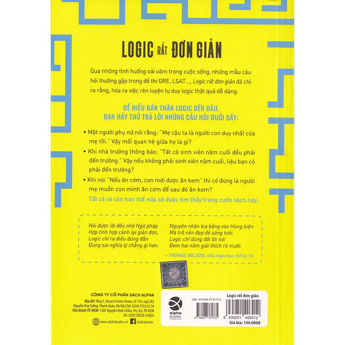 Mua tại TiktokLogic Rất Đơn Giản Qua những tình huống khó khăn cần xử trí trong cuộc sống, những câu hỏi giúp bạn cải thiện điểm thi trong bài GRE, LSAT…, Logic rất đơn giản đã chỉ ra rằng, logic hóa ra không phải là điều bất khả. Cuốn sách này không giống những cuốn sách khác về logic. Ở đây, bạn sẽ hiểu được tại sao tư duy logic lại không hề dễ dàng. Nếu bạn nghĩ mình khá logic thì hãy thử một vài câu đố logic mà những người khác thấy khó nhằn. Kể cả nếu bản thân bạn không mắc bẫy tư duy, cuốn sách này cũng sẽ giúp bạn hiểu những khó khăn mà người khác gặp phải. BẠN LOGIC ĐẾN ĐÂU? BẠN CÓ THỂ TRẢ LỜI NHỮNG CÂU HỎI SAU?
