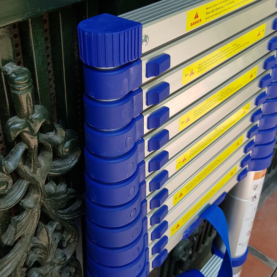 - Đặt thang dựa vào tường theo thiết kế góc an toàn của từng loại thang. Luôn đảm bảo khoảng cách tính từ chân thang vào trong tường không quá rộng. Lưu ý khi sử dụng: - Khi sử dụng để leo khoan đục tường phải lau sạch các ống thang trước khi thu gọn thang lại tránh để cát bụi bám vào ống thang. - Tránh để dơi va đập mạnh làm móp ống thang. - Khi thu gọn thang dùng 1 tay giữ bậc trên và 1 tay bấm khóa.