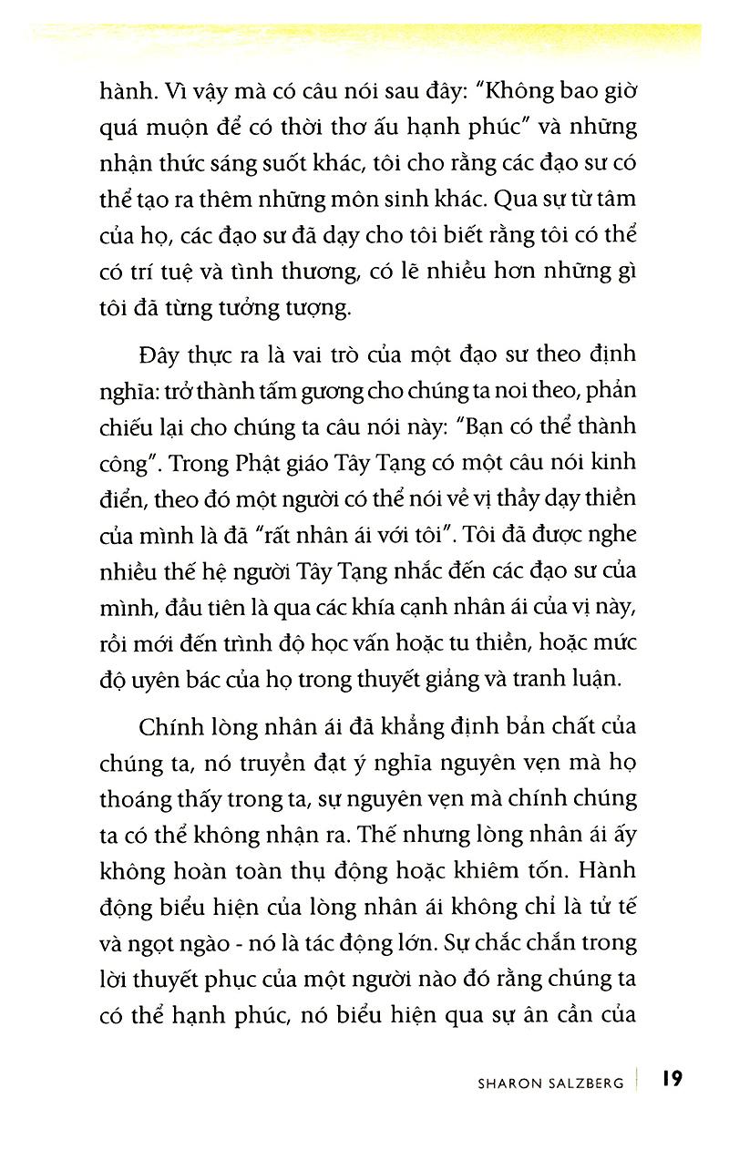 Điều gì sẽ xảy ra nếu lòng tốt và sự bao dung là kỹ năng tiềm ẩn mà bạn có thể phát triển? Với sách Thay đổi cuộc đời bằng tình thương và lòng trắc ẩn, Sharon Salzberg hướng dẫn độc giả trải nghiệm quá trình khám phá sức mạnh đích thực của lòng nhân ái và sử dụng nó làm hướng đi cho cuộc sống hàng ngày. Qua sách những câu chuyện mang tính giáo huấn, những hiểu biết sâu sắc từ những năm tháng làm chuyên gia hướng dẫn thiền định của Sharon và qua những bài tập thực hành, bạn sẽ học được cách nuôi dưỡng sự thanh thản, mở rộng trái tim đồng cảm và thể hiện sức mạnh của tình yêu thương tới mọi người.