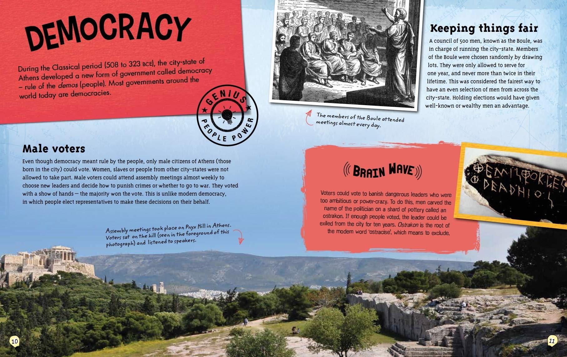 Which genius ideas and inventions began with the ancient Greeks? What did they develop that we use to this day? Find out how the ancient Greeks organised their society, trained their soldiers, used their ships for trade and transport and built their temples. Discover their brilliant developments in architecture, politics, art, medicine, theatre and sport that have influenced the way we live today.