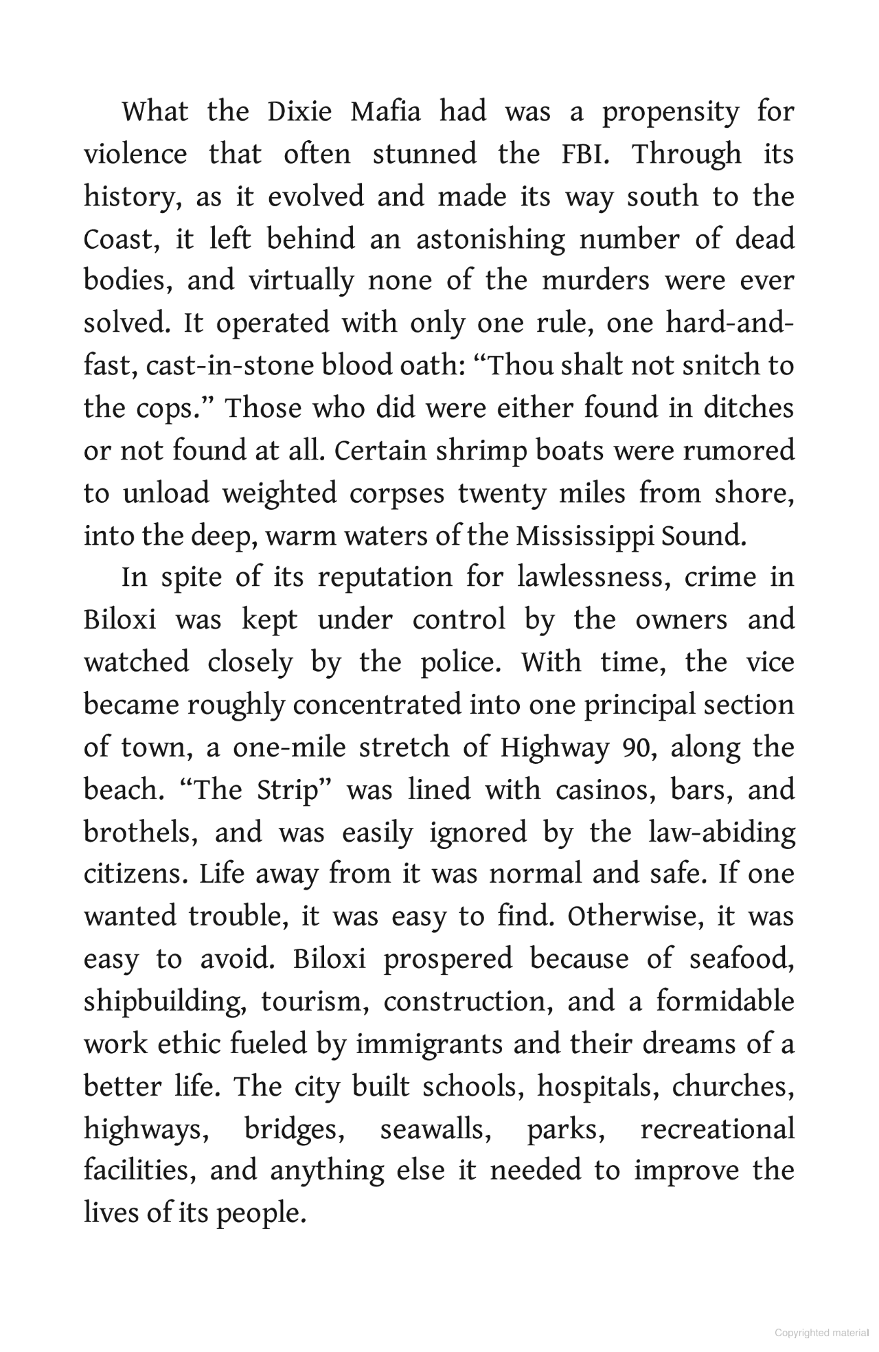 For most of the last hundred years, Biloxi was known for its beaches, resorts, and seafood industry. But it had a darker side. It was also notorious for corruption and vice, everything from gambling, prostitution, bootleg liquor, and drugs to contract killings. The vice was controlled by small cabal of mobsters, many of them rumored to be members of the Dixie Mafia.