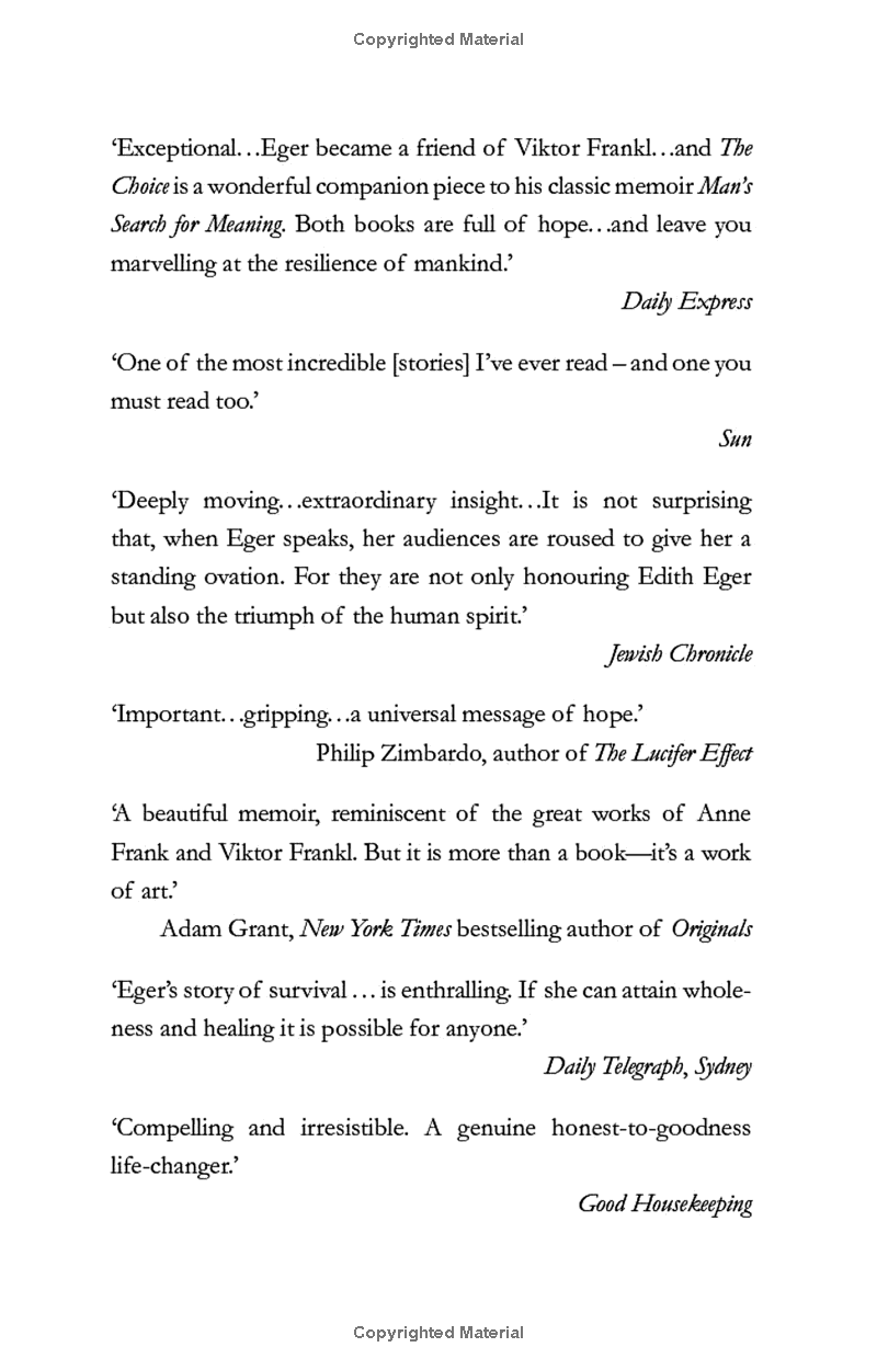 THE AWARD-WINNING INTERNATIONAL BESTSELLER by Edith Eger, as seen on BBC Breakfast Even in hell, hope can flower 'One of those rare and eternal stories you don't want to end and that leave you forever changed' - Desmond Tutu 'A masterpiece of holocaust literature. Her memoir, like her life, is extraordinary, harrowing and inspiring in equal measure' – The Times Literary Supplement ‘I can’t imagine a more important message for modern times. Eger’s book is a triumph' - The New York Times 'Little dancer', Mengele says, ‘dance for me’ In 1944, sixteen-year-old ballerina Edith Eger was sent to Auschwitz. Separated from her parents on arrival, she endures unimaginable experiences, including being made to dance for the infamous Josef Mengele. When the camp is finally liberated, she is pulled from a pile of bodies, barely alive. The horrors of the Holocaust didn't break Edith. In fact, they helped her learn to live again with a life-affirming strength and a truly remarkable resilience. The Choice is her unforgettable story. It shows that hope can flower in the most unlikely places .