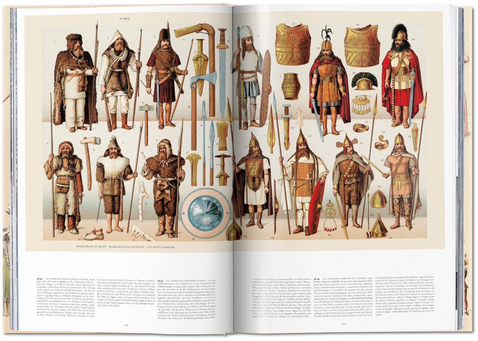 Cuốn sách trình bày các hình minh họa màu sắc chính xác, sắc sảo của Racinet, cũng như những mô tả thú vị và lời bình thường dí dỏm của anh ấy. Trải dài mọi thứ từ trang phục cổ đại của người Etruscan đến thời trang cao cấp của phụ nữ Pháp, chất liệu được sắp xếp theo kế hoạch ban đầu của Racinet theo văn hóa và chủ đề.