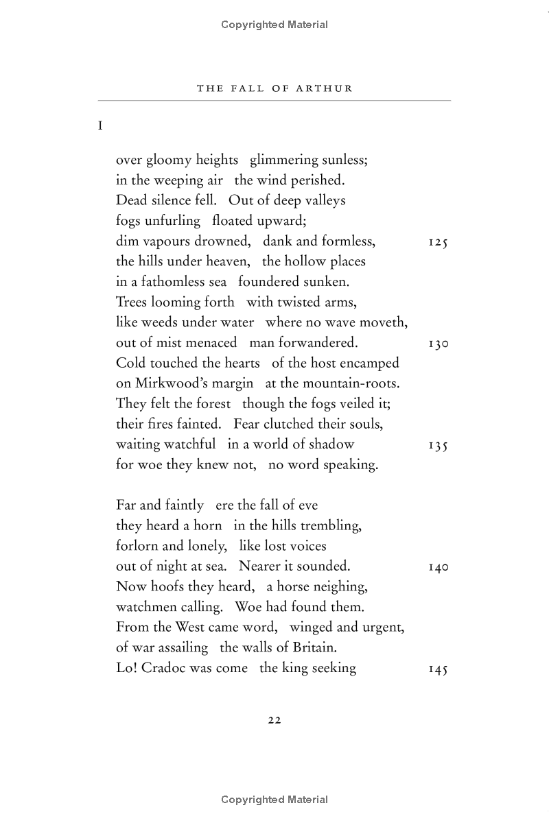 The Fall of Arthur, the only venture by J.R.R. Tolkien into the legends of Arthur King of Britain, may well be regarded as his finest and most skilful achievement in the use of the Old English alliterative metre, in which he brought to his transforming perceptions of the old narratives a pervasive sense of the grave and fateful nature of all that is told: of Arthur's expedition overseas into distant heathen lands, of Guinevere's flight from Camelot, of the great sea-battle on Arthur's return to Britain, in the portrait of the traitor Mordred, in the tormented doubts of Lancelot in his French castle.