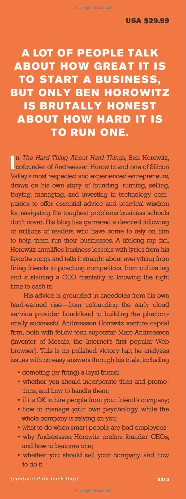 The Hard Thing About Hard Things Ben Horowitz, cofounder of Andreessen Horowitz and one of Silicon Valley's most respected and experienced entrepreneurs, offers essential advice on building and running a startup—practical wisdom for managing the