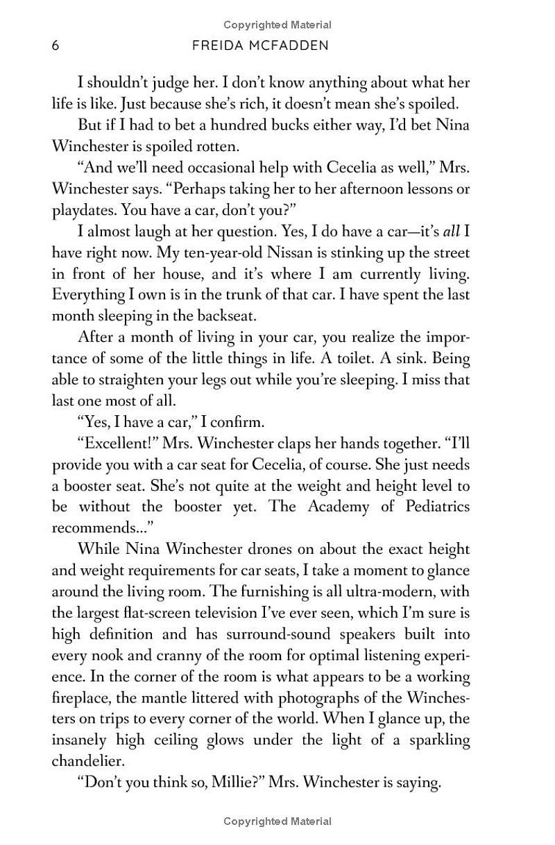 I try to ignore how Nina makes a mess just to watch me clean it up. How she tells strange lies about her own daughter. And how her husband Andrew seems more broken every day. But as I look into Andrew’s handsome brown eyes, so full of pain, it’s hard not to imagine what it would be like to live Nina’s life. The walk-in closet, the fancy car, the perfect husband.