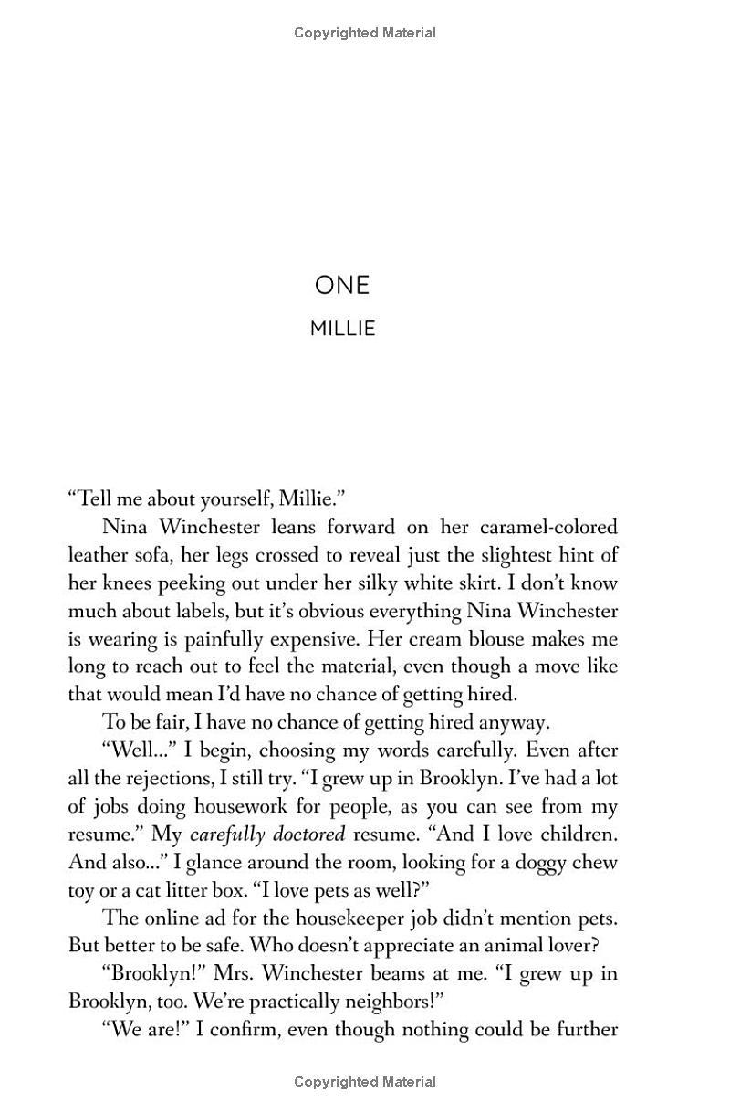 I try to ignore how Nina makes a mess just to watch me clean it up. How she tells strange lies about her own daughter. And how her husband Andrew seems more broken every day. But as I look into Andrew’s handsome brown eyes, so full of pain, it’s hard not to imagine what it would be like to live Nina’s life. The walk-in closet, the fancy car, the perfect husband.