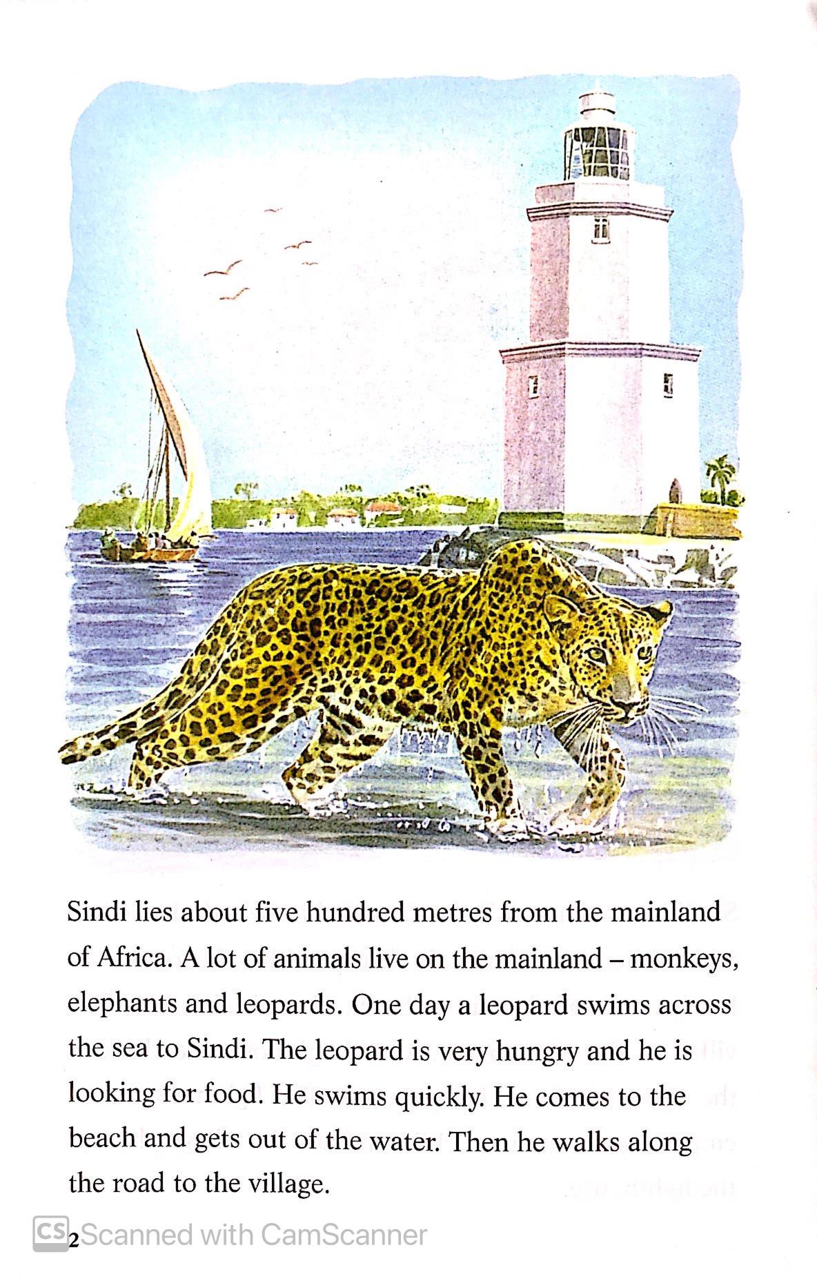 Original / British English One day a leopard swims across the sea to Sindi. He is hungry and he is looking for food. He runs into an old lighthouse. The people of Sindi do not