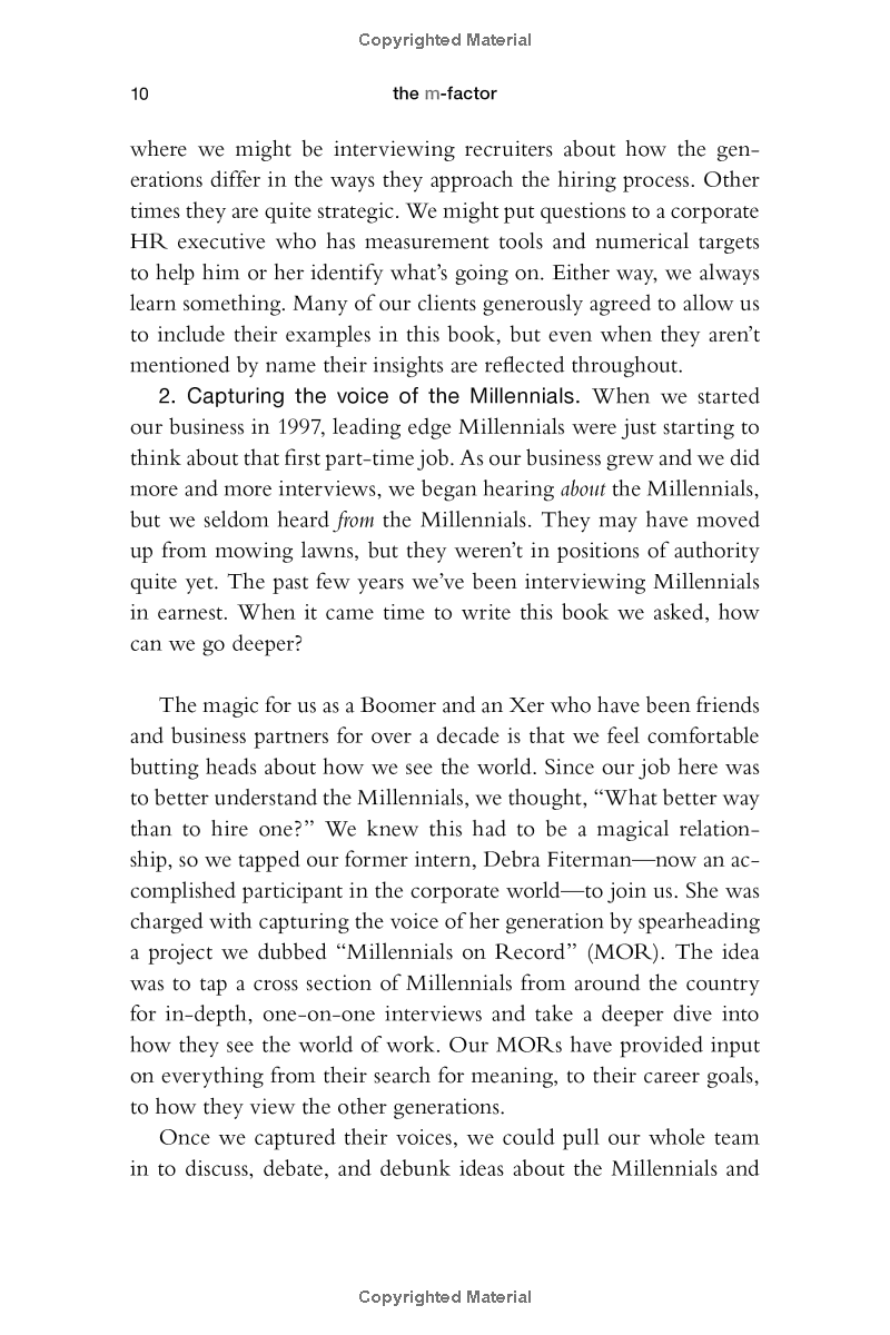 The M-Factor: How the Millennial Generation Is Rocking the Workplace From Lynne C. Lancaster and David Stillman, the nationally recognized generational experts and authors of When Generations Collide, comes the definitive guide to “Millennials” (those born