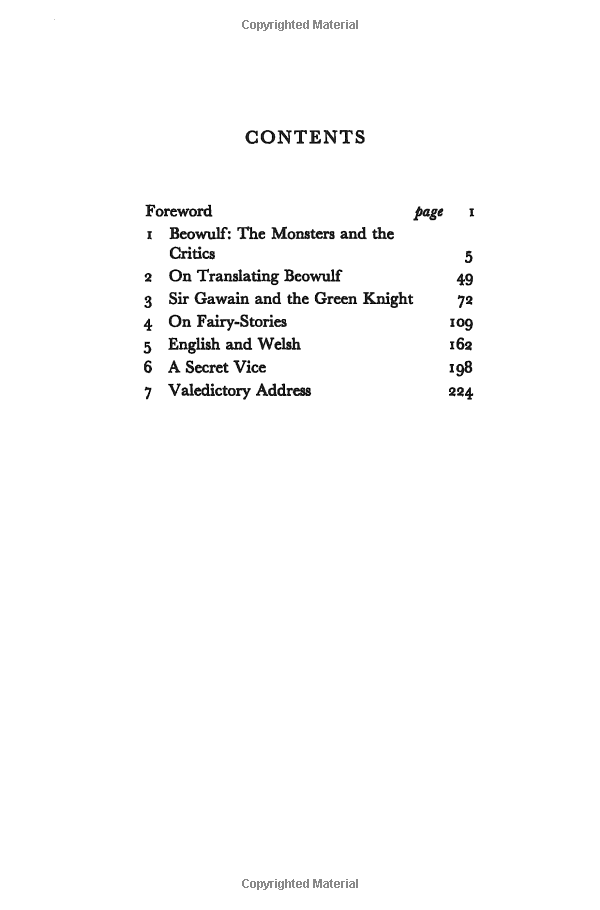 The seven 'essays' by J.R.R. Tolkien assembled in this new paperback edition were with one exception red as general lectures on particular occasions; and while they mostly arose out of Tolkien's work in medieval literature, they are accessible to all. Two of them are concerned with Beowulf, including the well-known lecture whose title is taken for this book, and one with Sir Gawain and the Green Knight, given in the University of Glasgow in 1953.