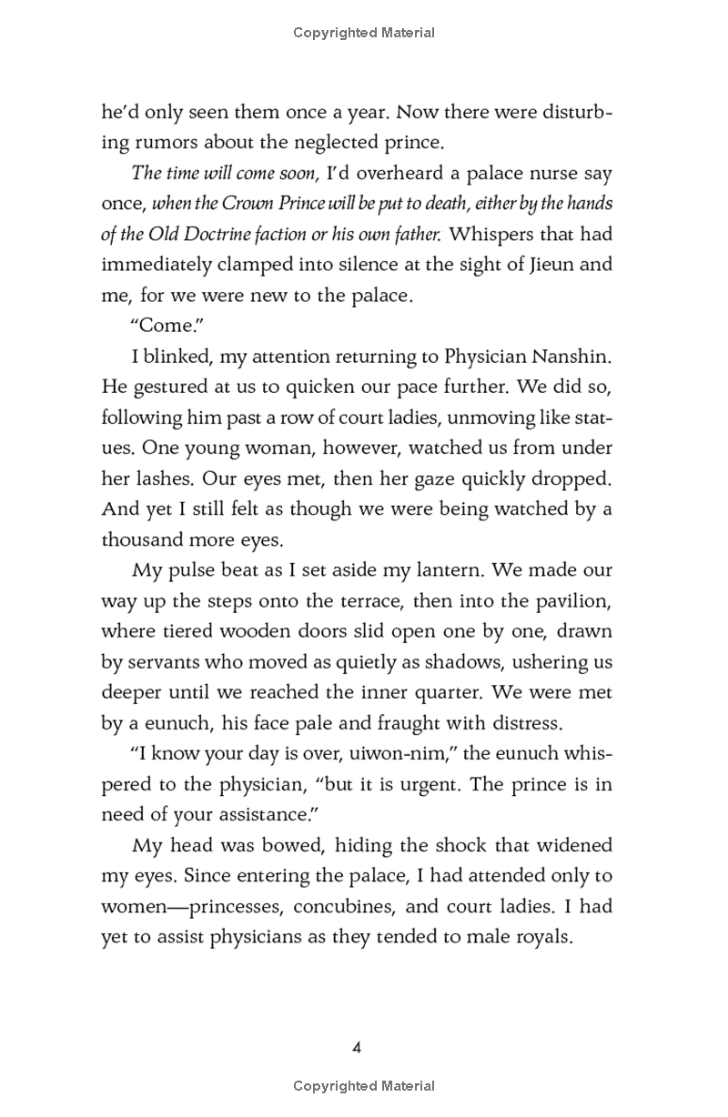 Joseon (Korea), 1758. There are few options available to illegitimate daughters in the capital city, but through hard work and study, eighteen-year-old Hyeon has earned a position as a palace nurse. All she wants is to keep her head down, do a good job, and perhaps finally win her estranged father's approval.