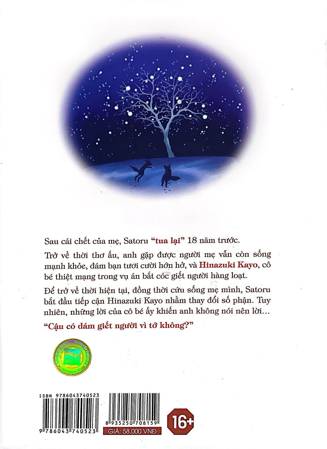Mua tại TiktokSau cái chết của mẹ, Fujinuma Satoru cố truy đuổi tên hung thủ nhưng không thành. Trong cơn cùng quẫn, anh sử dụng khả năng “tua lại” nhưng lại trở về tận 18 năm trước. Anh gặp được người mẹ vẫn còn sống mạnh khỏe, những đứa bạn ồn ào, và cả cô gái là khởi đầu của vụ bắt cóc giết người hàng loạt, Hinazuki Kayo. Mục đích của lần “tua lại” này là gì? Hãy cùng đón đọc tập 2 của bộ truyện Thị trấn vắng mình tôi.