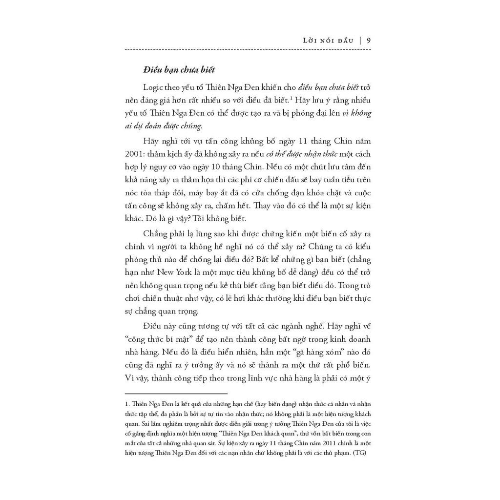 Chúng ta không biết rất nhiều thứ nhưng lại hành động như thể mình có khả năng dự đoán được mọi điều. Và trong cuốn sách này, tác giả Nassim Nicholas Taleb đã đi sâu vào khai thác những sai lầm của tư tưởng cố hữu ấy. Theo ông, “thiên nga đen” là một biến cố tưởng chừng như không thể xảy ra với ba đặc điểm chính: không thể dự đoán, có tác động nặng nề và sau khi nó xảy ra, người ta lại dựng lên một lời giải thích để khiến nó trở nên ít ngẫu nhiên hơn, dễ dự đoán hơn so với bản chất thật của nó. Thành công đáng kinh ngạc của Fb có thể được coi là một “thiên nga đen”, việc nước Anh rời khỏi Liên minh châu u cũng là một “thiên nga đen”. Thiên nga đen luôn ẩn hiện trong mọi mặt của cuộc sống với những tác động khó lường, theo cả hướng tiêu cực và tích cực.