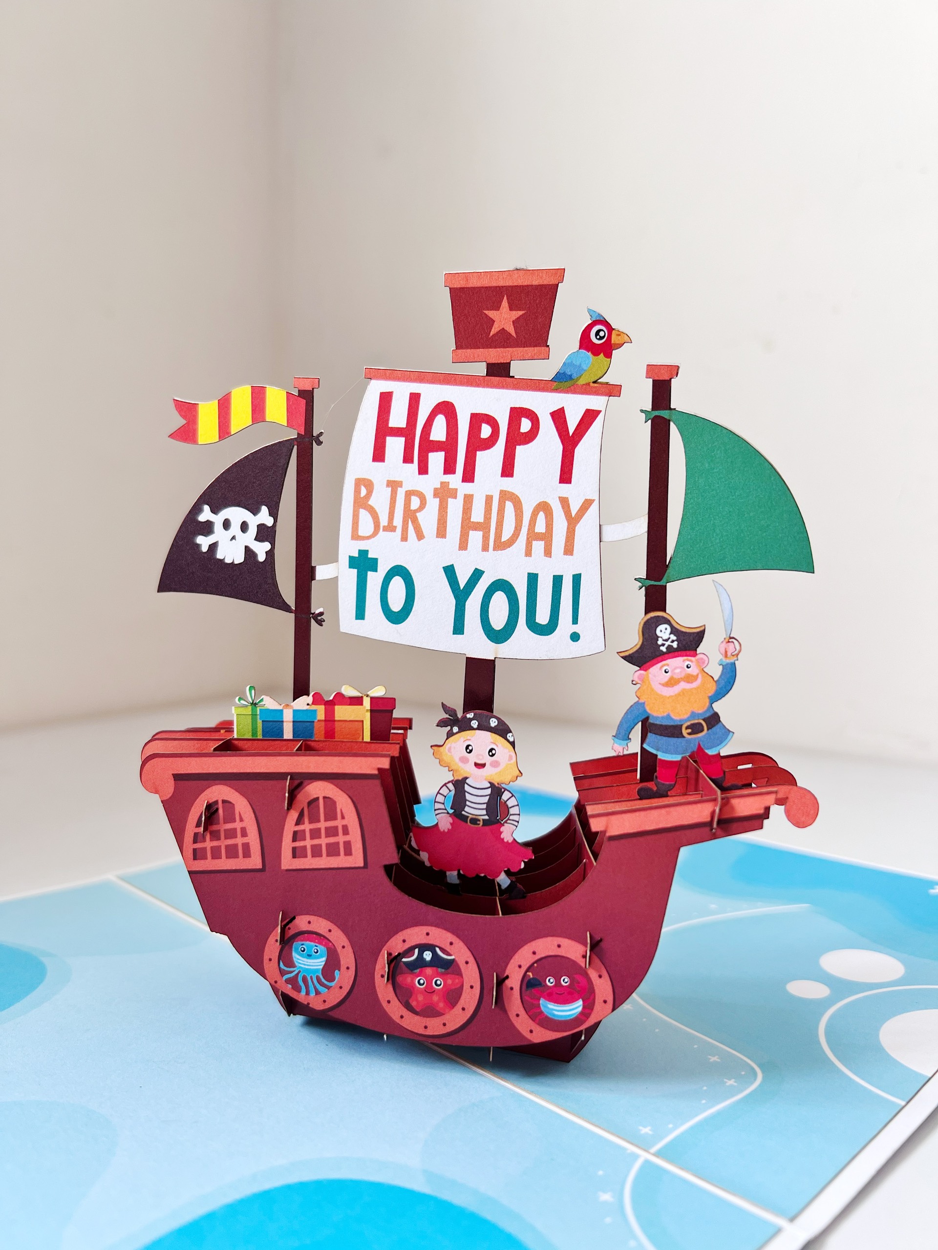 Tạo bất ngờ thú vị với thiệp 3D Pop Up thuyền cướp biển độc đáo. Khi mở thiệp, con thuyền gỗ với cánh buồm in dòng chữ “Happy Birthday To You!” bật nổi sống động, kèm theo hình ảnh hải tặc, quà tặng và bong bóng đầy màu sắc.