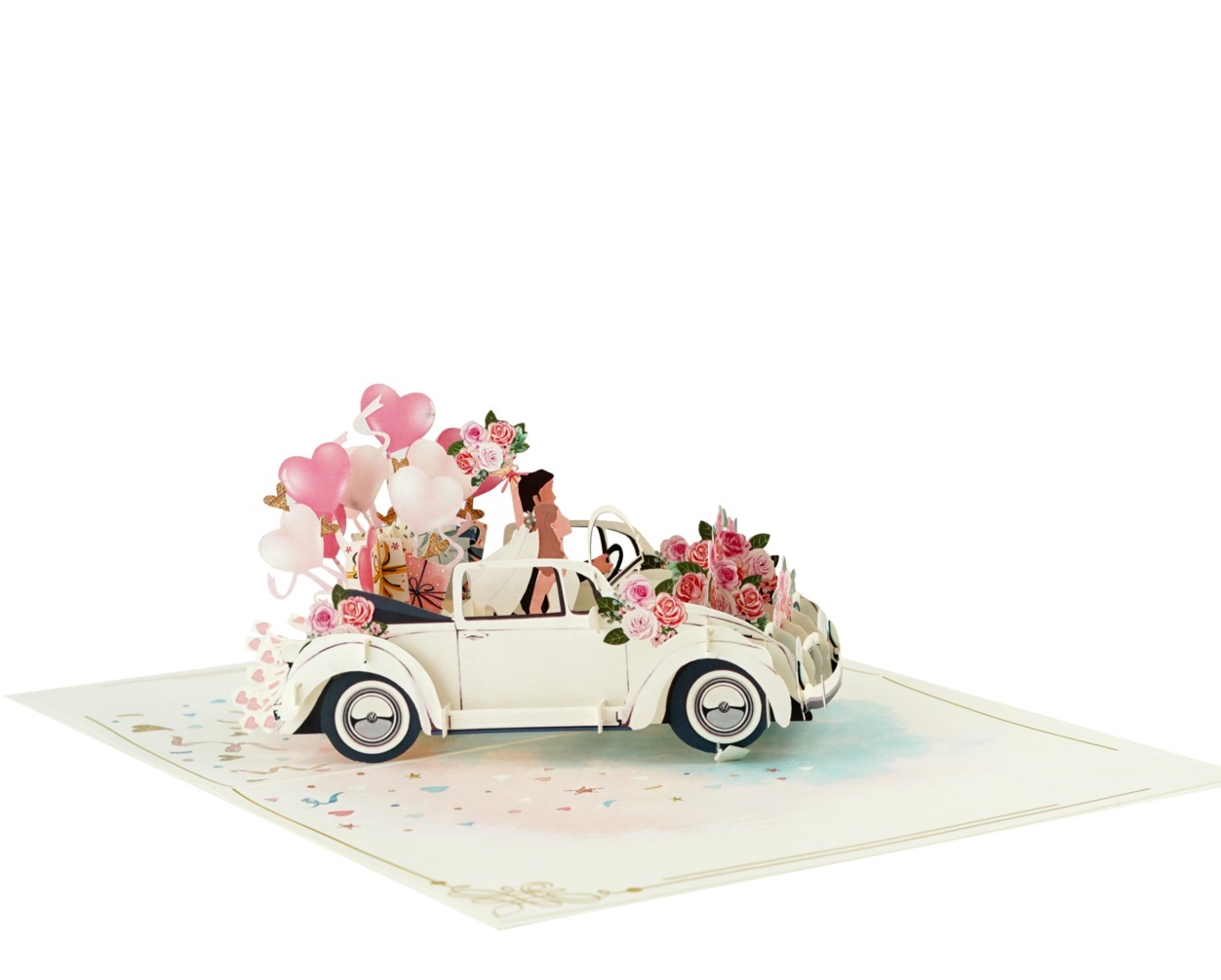Tạo dấu ấn khó quên với thiệp 3D Pop Up xe cưới trắng Just Married. Khi mở ra, hình ảnh chiếc xe cưới bật nổi sang trọng, trang trí hoa hồng, bóng bay trái tim và quà tặng rực rỡ, kèm cặp đôi cô dâu chú rể hạnh phúc ngồi trên xe.