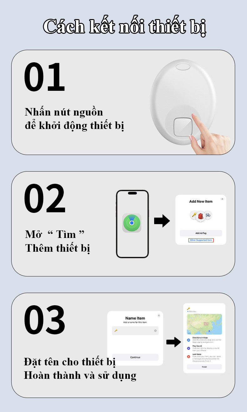 Thiết bị sử dụng pin cúc áo, rất tiện lợi, có thể dùng 6 -12 tháng mới phải thay. Thiết bị không cần sim, định vị thông qua các thiết bị Apple ở xung quanh.