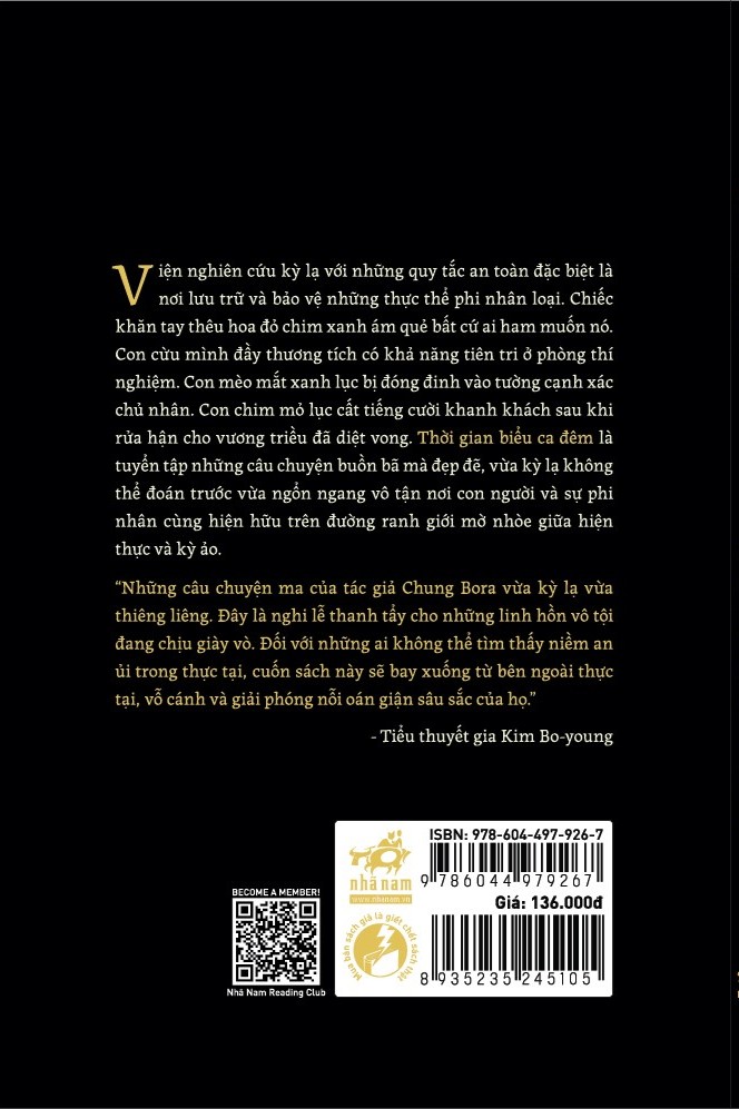 Mua tại TiktokViện nghiên cứu kỳ lạ với những quy tắc an toàn đặc biệt là nơi lưu trữ và bảo vệ những thực thể phi nhân loại. Chiếc khăn tay thêu hoa đỏ chim xanh ám quẻ bất cứ ai ham muốn nó. Con cừu mình đầy thương tích có khả năng tiên tri ở phòng thí nghiệm. Con mèo mắt xanh lục bị đóng đinh vào tường cạnh xác chủ nhân. Con chim mỏ lục cất tiếng cười khanh khách sau khi rửa hận cho vương triều đã diệt vong. Thời gian biểu ca đêm là tuyển tập những câu chuyện buồn bã mà đẹp đẽ, vừa kỳ lạ không thể đoán trước vừa ngổn ngang vô tận nơi con người và sự phi nhân cùng hiện hữu trên đường ranh giới mờ nhòe giữa hiện thực và kỳ ảo.