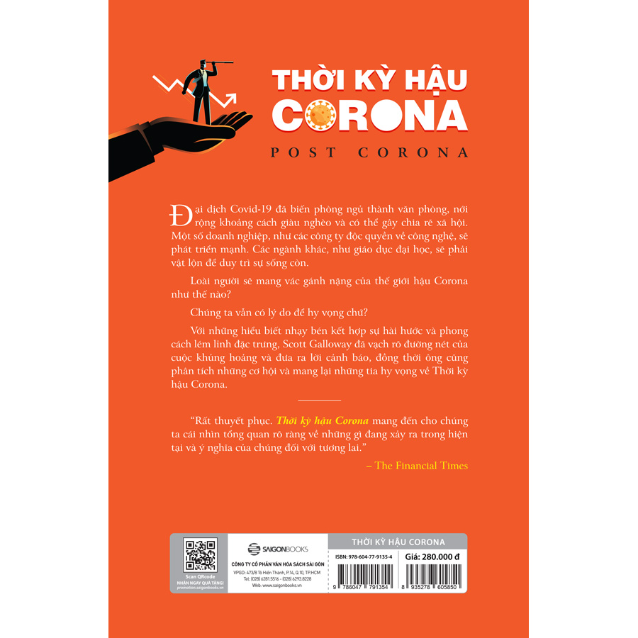 Xuất thân là một doanh nhân và là giáo sư dạy ở trường kinh tế, vì vậy, Scott Galloway nhìn mọi thứ qua lăng kính kinh doanh. Và nội dung cốt lõi của Thời kỳ hậu Corona: Luôn có cơ hội trong khủng hoảng sẽ nói về cách thức cơn đại dịch định hình lại môi trường kinh doanh. Việc kinh doanh phải được xem xét trong một bối cảnh cụ thể, vì vậy tác giả sẽ kết nối câu chuyện kinh doanh với câu chuyện xã hội rộng lớn hơn của chúng ta. Scott Galloway cũng dành hẳn một chương cho giáo dục đại học, vì ông tin rằng nền giáo dục đang trong cao trào chuyển đổi mạnh mẽ về bản chất.