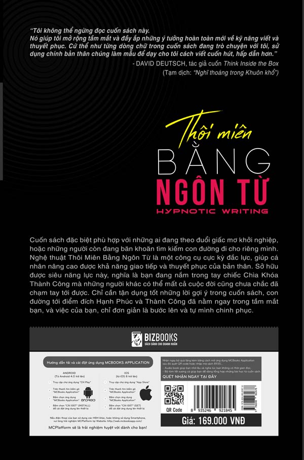 Thôi miên Bằng Ngôn từ không chỉ bàn về kỹ năng viết khiến người đọc bị mê hoặc mà CHÍNH NÓ cũng có thể mê hoặc bất kỳ độc giả nào. Cuốn sách chỉ cho bạn thấy cách trở nên thuần thục trong việc nắm bắt sự chú ý của khách hàng tiềm năng, giữ chân họ, khiến họ phải hành động! Chưa bao giờ có một kho báu quý giá như vậy về kỹ năng xây dựng những bản thảo làm mê đắm lòng người. Những bí quyết trong cuốn sách đều có thể áp dụng ngay lập tức. Đây là công cụ tham khảo toàn năng cho việc soạn thảo văn bản. Đây không phải một cuốn sách mà bạn đọc xong rồi bỏ quên trên giá suốt 20 năm. Nó sẽ nằm ngay trên bàn làm việc để bạn có thể sử dụng hàng ngày.