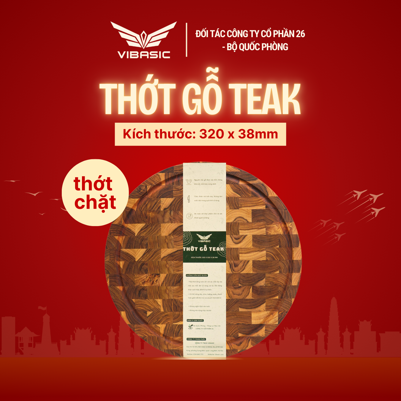 Thớt gỗ Teak Vibasic A80 phiên bản YÊU NƯỚC, thớt chặt ghép dựng block kích thước 320x38mm, khắc logo 80 năm 2/9 dùng để cắt thái, băm chặt thực phẩm Đặc điểm nổi bật -